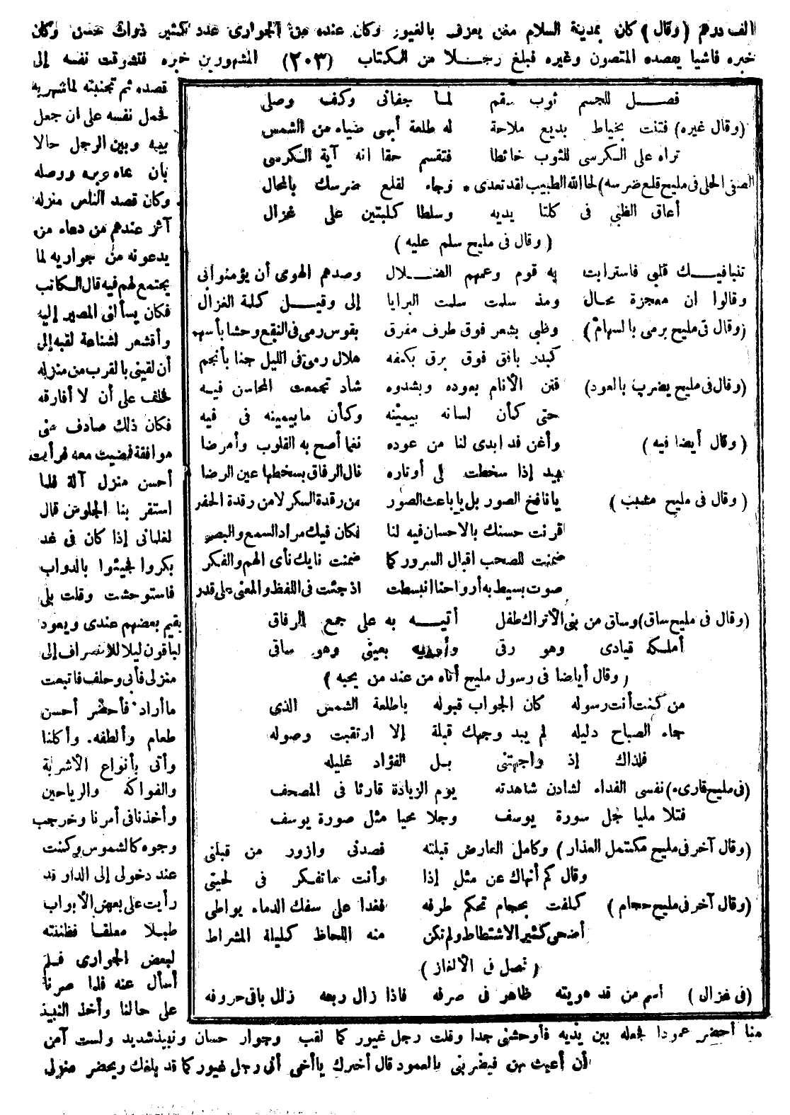 وقال كان بمدينة السلام مغن يعرف بالغيور وكان عنده من الجواري عدد كثير ذوات حسن وكان خبره فاشياً يقصده المتصون وغيره فبلغ رجلاً من الكتاب المشهورين خبره فتشوقت نفسه إلى قصده ثم تجنبته لما شهر به فحمل نفسه على أن جعل بينه وبين الرجل حالاً بأن دعاه وبرَّه ووصله وكان قصد الناس منزله آثر عندهم من دعاء من يدعونه من جواريه لما يجتمع لهم فيه قال الكاتب يسألني المصير إليه وأقشعر لشناعة لقبه إلى أن لقيني بالقرب من منزله فحلف على أن لا أفارقه فكان ذلك أن صادف مني موافقة فمضيت معه فرأيت أحسن موافقة وآلة فلما استقر بنا الجلوس قال لغلماني إذا كان في غد بكروا فجيئوا بالدواب فاستوحشت وقلت بلى يقيم بعضهم عندي ويعود الباقون ليلا للأنصراف إلى منزلي فأبى وحلف فاتبعت ما أراد فأحضر أحسن طعام وألطفه وأكلنا وأتى بأنواع الأشربة والفواكه والرياحين وأخذنا في أمرنا وخرجت وجوه كالشموس وكنت عند دخولي إلى الدار قد رأيت على بعض الأبواب طبلاً معلقاً فظننته لبعض الجواري فلم أسأل عنه فلما صرنا على حالنا وأخذ النبيذ منا أحضر عموداً فجعله بين يديه فأوحشني جداً وقلت رجل غيور كما لقب وجوار حسان ونبيذ شديد ولست آمن أن أعبث بهن فيضربني بالعمود قال أخبرك يا أخي أني رجل غيور كما قد بلغك ويحضر منزل