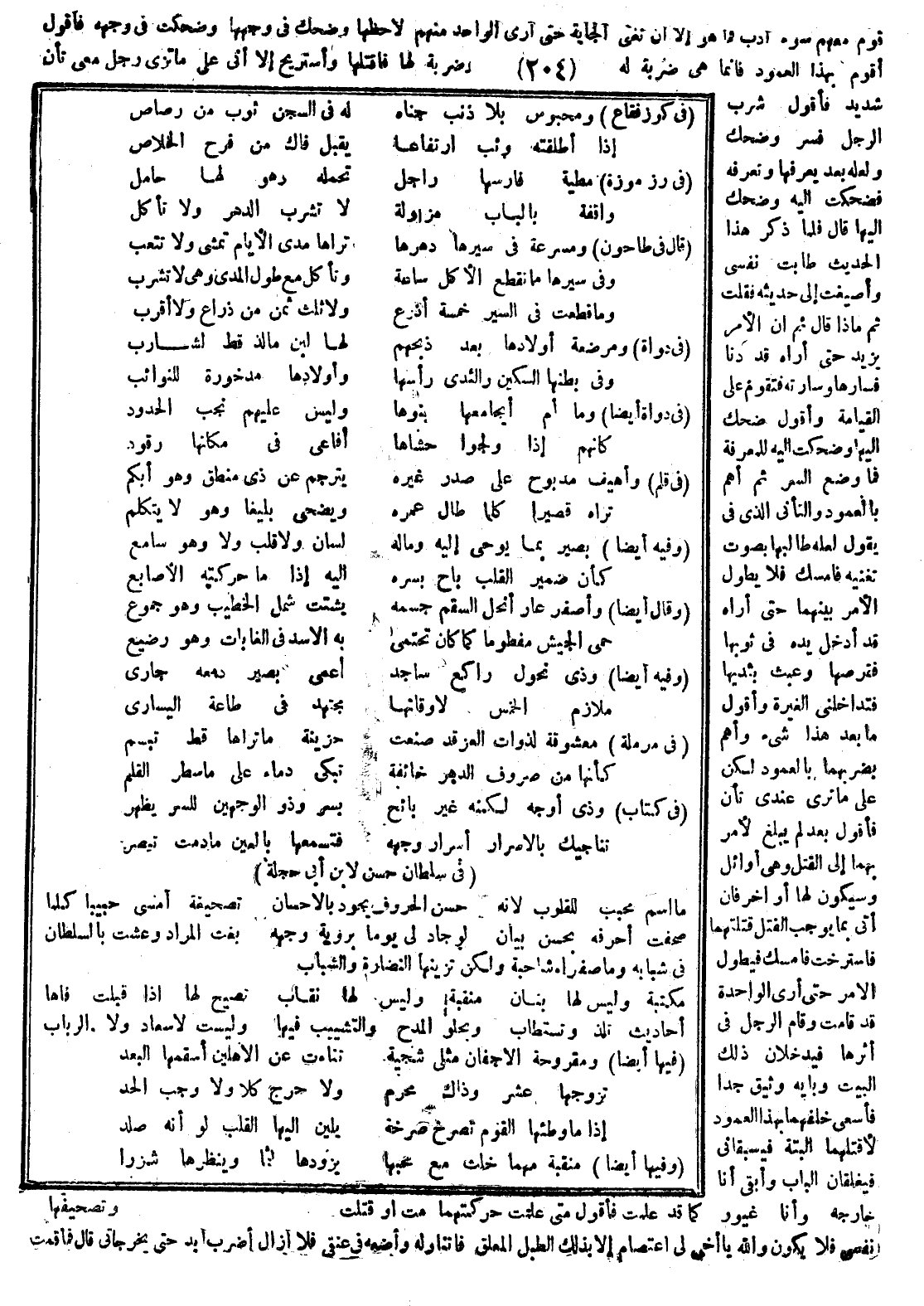 قوم معهم سوء أدب فما هو إلا أن تغنى الجارية حتى أرى الواحد منهم قد لاحظها وضحك في وجهها وضحكت في وجهه فأقول أقوم بهذا العمود فإنما هي ضربة له وضربة لها فأقتلهما وأستريح إلا أني على ما ترى رجل معي تأن شديد فأقول شرب الرجل فسر وضحك ولعله بعد يعرفها وتعرفه فضحكت إليه وضحك إليها قال فلما ذكر هذا الحديث طابت نفسي وأصغيت إلى حديثه فقلت ثم ماذا قال ثم إن الأمر يزيد حتى أراه قد دنا فسارَّها وسارته فتقوم عليَّ القيامة وأقول ضحك إليها وضحكت إليه للمعرفة فما وضع السر ثم أهم بالعمود والتأني الذي فيَّ يقول لعله طالبها بصوت تغنيه فأمسك فلا يطول الأمر بينهما حتى أراه قد أدخل يده في ثوبها فقرصها وعبث بثديها فتداخلني الغيرة وأقول ما بعد هذا شيء وأهم بضربهما بالعمود لكن على ما ترى عندي تأن فأقول بعد لم يبلغ الأمر بهما إلى القتل وهي أوائل وسيكون لها أواخر فإن أتى بما يوجب القتل قتلتهما فاسترحت فأمسك فيطول الأمر حتى أرى الواحدة قد قامت وقام الرجل في أثرها فيدخلان ذلك البيت وبابه وثيق جداً فأسعى خلفهما بهذا العمود لأقتلهما البتة فيسبقاني فيغلقان الباب وأبقى أنا خارجه وأنا غيور كما قد علمت فأقول متى علمت حركتهما مت أو قتلت نفسي فلا يكون والله يا أخي لي إعتصام إلا بذلك الطبل المعلق فأتناوله وأضعه في عنقي فلا أزال أضرب أبداً حتى يخرجا قال فما قمت