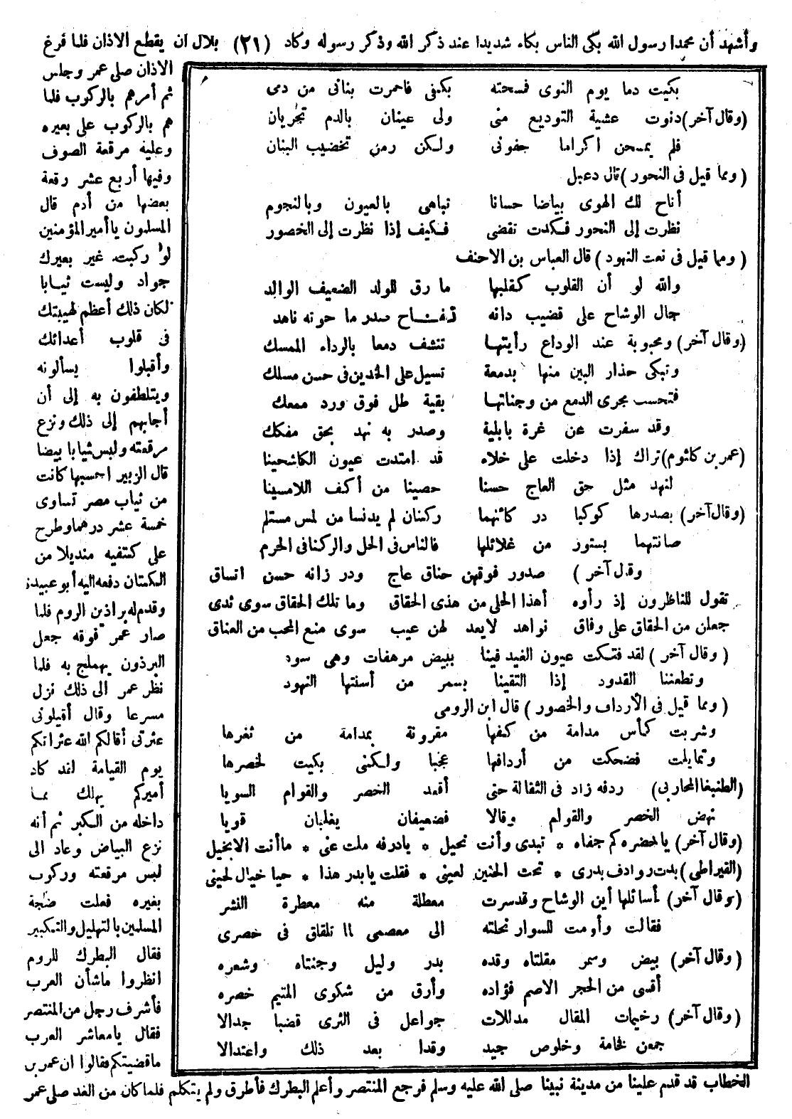 وأشهد أن محمداً رسول الله أبكى الناس بكاء شديداً عند ذكر رسوله وكاد بلال أن يقطع الأذان فلما فرغ الأذان صلى عمر وجلس ثم أمرهم بالركوب فلما همّ بالركوب من بعيره وعليه مرقعة الصوف وفيها أربع عشرة رقعة بعضها من آدم قال المسلمون يا أمير المؤمنين لو ركبت غير بعيرك جواداً ولبست ثيابا لكان ذلك أعظم لهيبتك في قلوب أعدائك وأقبلوا يسألونه ويتلطفون به إلى أن أجابهم إلى ذلك ونزع مرقعته ولبس ثياب بيضا قال الزبير أحسبها كانت من ثياب مصر تساوي خمسة عشرة درهما وطرح على كتفيه منديلاً من الكتان دفعه إلى أبو عبيدة وقدذم له برذونا أشهب من براذين الروم فلما صار عمر فوقه جعل البرذون يهملج به فلما نظر عمر إلى ذلك نزل مسرعاً وقال أقيلوا عثرتي أقالكم الله عثراتكم يوم القيامة لقد كاد أميركم يهلك مما داخله من الكبر ثم إنه نزع البياض وعاد إلى لبس مرقعته وركوب بعيره فعلت ضجة المسلمين بالتهليل والتكبير فقال البطرك للروم أنظروا ما شأن العرب فأشرف رجل من المتنصرة فقال يا معشر العرب ما قضيتكم فقالوا أن عمر بن الخطاب قد قدم علينا من مدينة نبينا صلى الله عليه وسلم فرجع المتنصر وأعلم البطرك فأطرق ولم يتكلم فلما كان من الغد صلى عمر