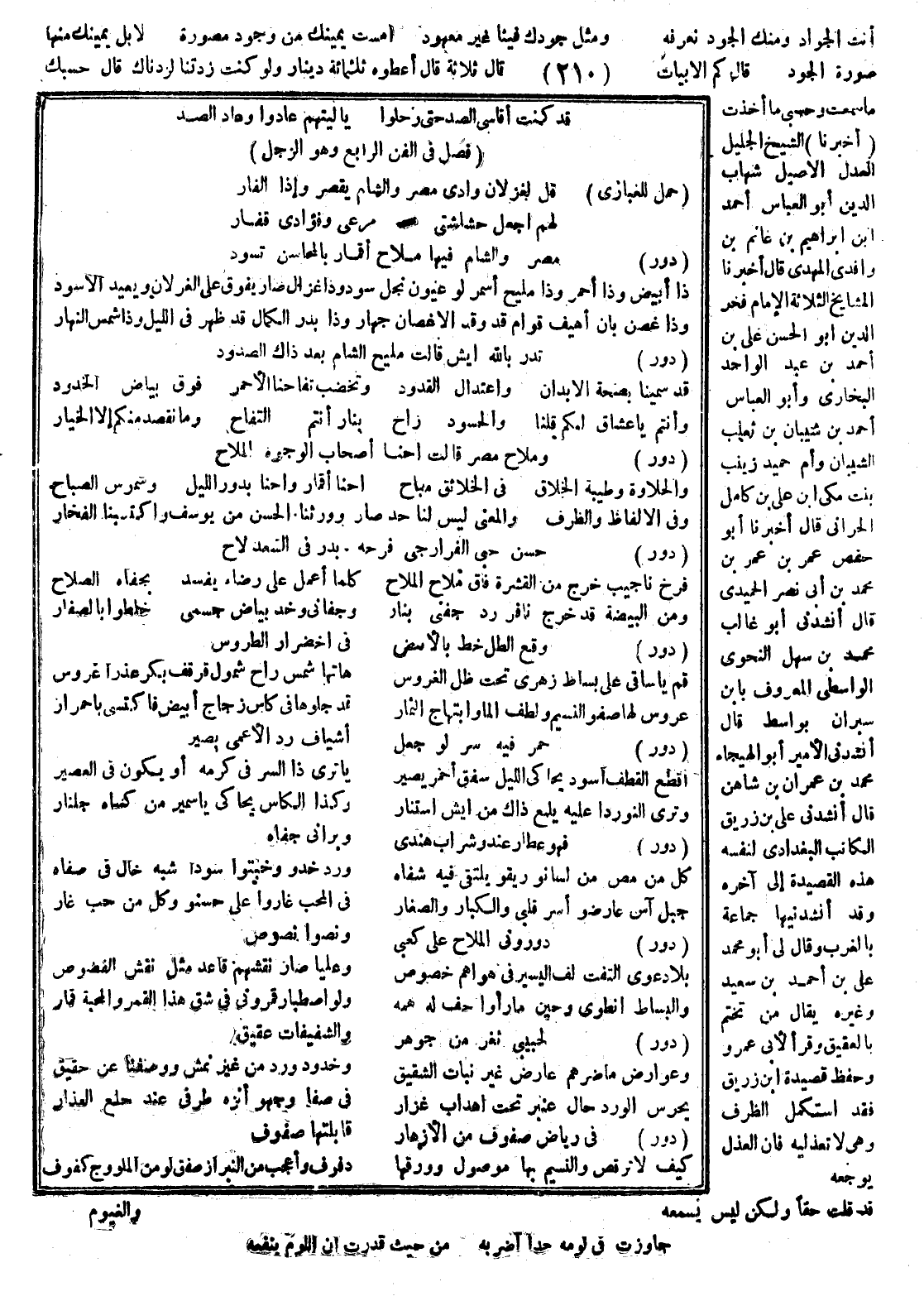 أخبرنا الشيخ الجليل العدل الأصيل شهاب الدين أبو العباس أحمد بن إبراهيم بن غانم بن وافد المهدي قال أخبرنا المشايخ الثلاثة الإمام فخر الدين أبو الحسن علي ابن أحمد بن عبد الواحد البخاري وأبو العباس أحمد بن شيبان بن ثعلب الشيباني وأم حميد زينب بنت مكي بن علي بن كامل الحراني قال أخبرنا أبو حفص عمر بن عمر ابن محمد بن أبي نصر الحميدي قال أنشدني أبو غالب محمد بن سهل النحوي الواسطي المعروف بابن شبران بواسط قال أنشدني الأمير أبو الهيجاء محمد بن عمران بن زريق الكاتب البغدادي لنفسه هذه القصيدة إلى آخرها وقد أنشدنيها جماعة بالمغرب وقال لي أبو محمد علي بن أحمد بن سعيد وغيره يقال من تختم بالعقيق وقرأ لأبي عمرو وحفظ قصيدة ابن زريق فقد استكمل الظرف وهي: