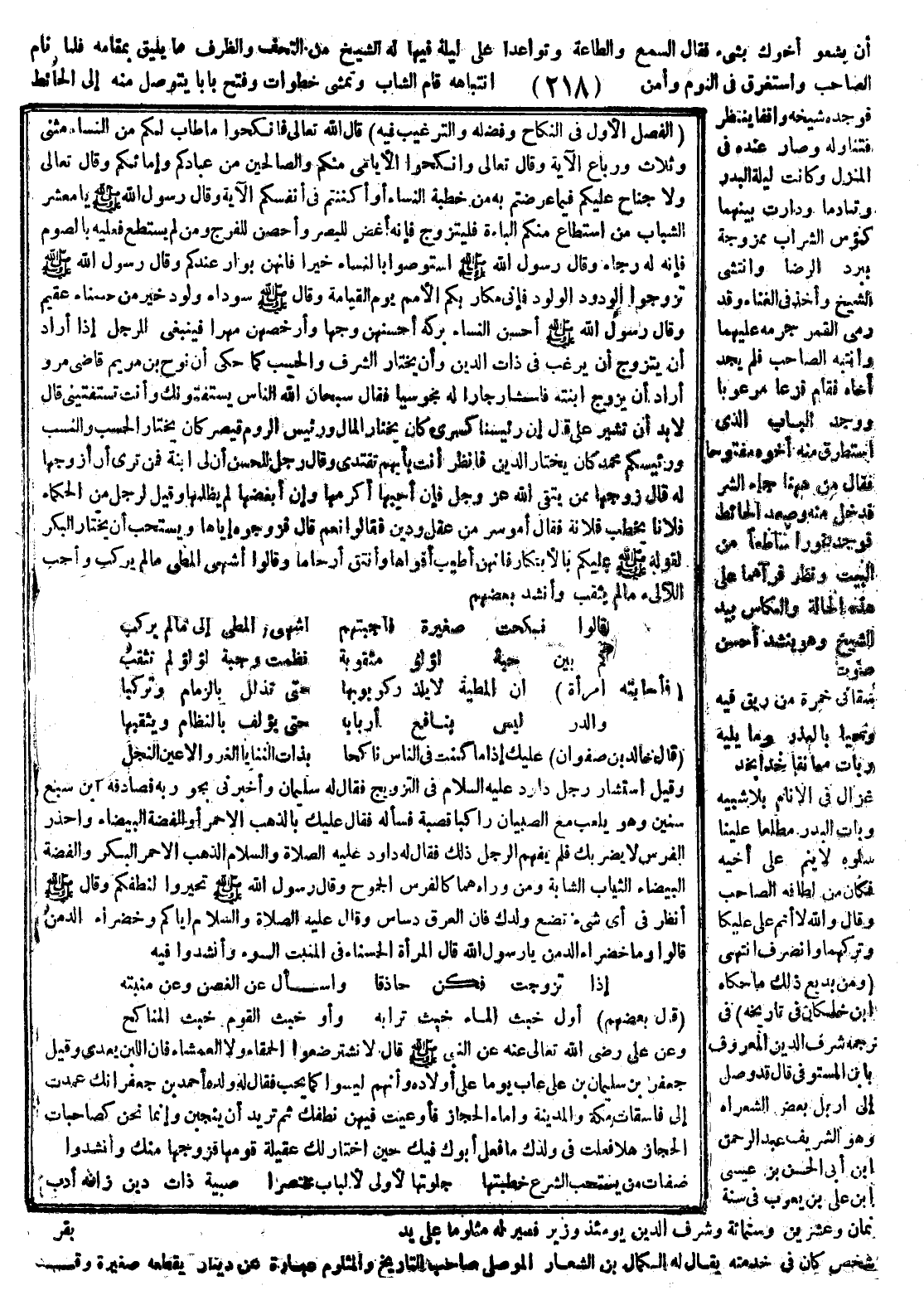 أن يشعر أخوك بشيء فقال السمع والطاعة وتواعدا على ليلة فهيأ له الشيخ من التحف والظرف ما يليق بمقامه فلما نام الصاحب واستغرق في النوم وأمن انتباهه قام الشاب وتمشى خطوات وفتح باب يتوصل منه إلى الحائط فوجد شيخه واقفاً ينتظره فتناوله وصار عنده في المنزل وكان ليلة البدر وتنادما ودارت بينهما كؤوس الشراب ممزوجة ببرد الرضاب وانتشى الشيخ وأخذ في الغناء وقد رمى القمر جرمه عليهما وانتبه الصاحب فلم يجد أخاه فقام فزعا مرعوباً ووجد الباب الذي استطرق منه أخوه مفتوحاً فقال من هنا جاء الشر فدخل منه وصعد الحائط فوجد نوراً ساطعاً من البيت ونظر فرآهما على هذه الحالة والكأس بيد الشيخ وهو ينشد أحسن صوت: