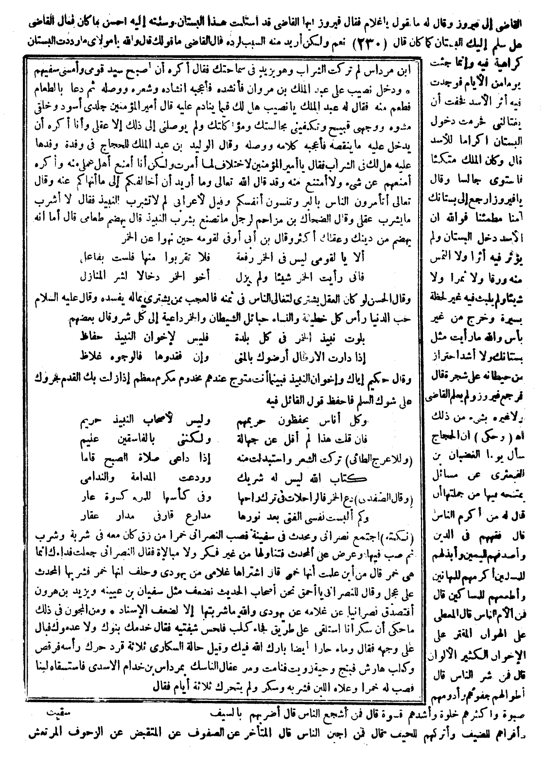 القاضي إلى فيروز وقال له ما تقول يا غلام فقال فيروز أيها القاضي قد استلمت هذا البستان وسلمته إليه أحسن ما كان فقال القاضي هل سلم إليك البستان كما كان قال نعم ولكن أريد منه السبب لرده قال القاضي ما قولك قال والله يا مولاي ما رددت البستان كراهية فيه وإنما جئت يوما من الأيام فوجدت فيه أثر الأسد فخفت أن يغتالني فحرمت دخول البستان إكراماً للأسد قال وكان الملك متكئاً فاستوى جالساً وقال يا فيروز إرجع إلى بستانك آمناً مطمئناً فوالله أن الأسد دخل البستان ولم يؤثر فيه أثراً ولا التمس منه ورقا ولا تمرا ولا شيئاً ولم يلبث فيه غير لحظة يسيرة وخرج من غير بأس، والله ما رأيت مثل بستانك ولا أشد احترازاً من حيطانه على شجره قال فرجع فيروز إلى داره ورد زوجته ولم يعلم القاضي ولا غيره بشيء من ذلك.