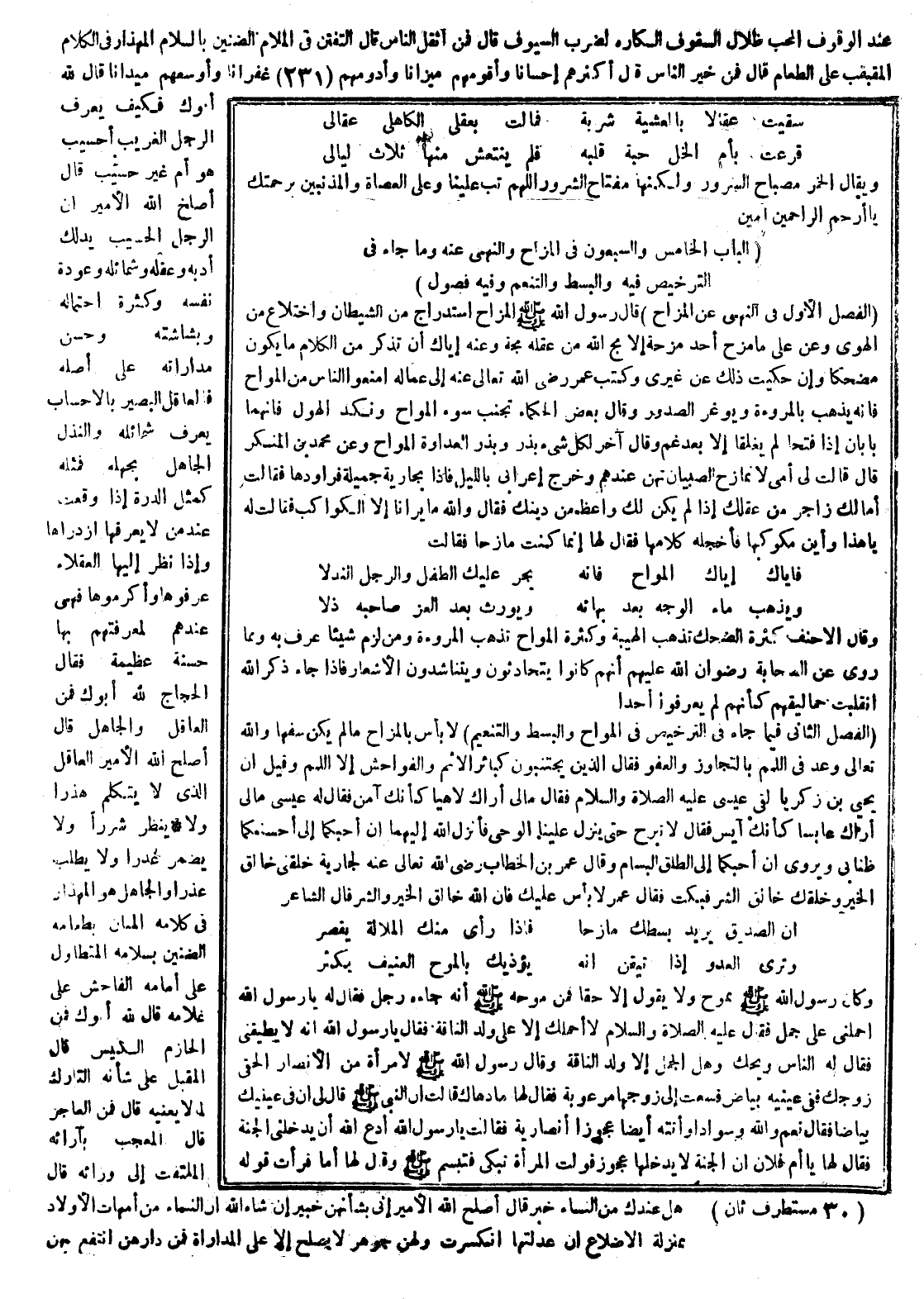 عند الوقوف المحب ظلال السقوف الكاره لضرب السيوف قال فمن أثقل الناس قال المتفنن في الملام الضنين بالسلام المهذار في الكلام المقبب على الطعام قال فمن خير الناس قال أكثرهم إحساناً وأقومهم ميزاناً وأدومهم غفراناً قال لله أبوك فكيف يعرف الرجل الغريب أحسيب هو أم غير حسيب قال أصلح الله الأمير إن الرجل الحسيب يدلك أدبه وعقله وشمائله وعزة نفسه وكثرة احتماله وبشاشته وحسن مداراته على أصله فالعاقل البصير بالإحسان يعرف شمائله والنذل الجاهل يجهلها فمثله كمثل الدرة إذا وقعت عند من لايعرفها ازدراها وإذا نظر إليها العقلاء عرفوها وأكرموها فهي عندهم لمعرفتهم بها عظيمة فقال الحجاج لله أبوك فمن العاقل والجاهل قال أصلح الله الأمير العاقل الذي لا يتكلم هذراً ولا ينظر شزراً ولا يضمر غدراً ولا يطلب عذراً والجاهل هو المهذار في كلامه المنَّان بطعامه الضنين بسلامه المتطاول على إمامه الفاحش على غلامه قال لله أبوك فمن الحازم الكيِّس قال المقبل على شأنه التارك لما لا يعنيه قال فمن العاجز قال المعجب بآرائه الملتفت إلى ورائه قال هل عندك من النساء خبر قال أصلح الله الأمير إني بشأنهن خبير إن شاء الله إن النساء من أمهات الأولاد بمنزلة الأضلاع إن عدّلتها انكسرت ولهن جوهر ولا يصلح إلا على المدارة فمن دارهنَّ انتفع بهن