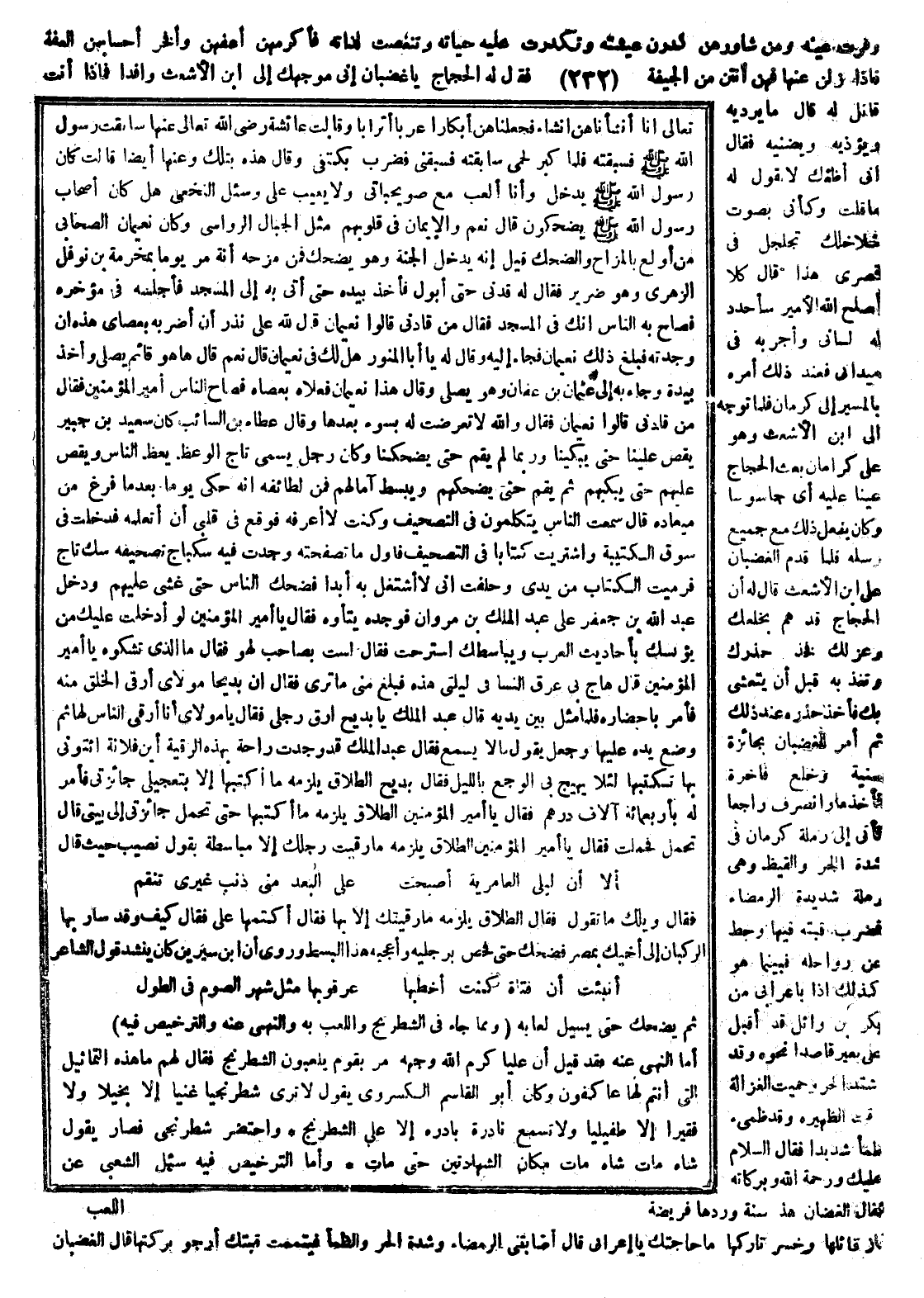 وقرّت عينه ومن شاورهنَّ كدرن عيشته وتكدرت عليه حياته وتنغصت لذاته فأكرمهن أعفهن وأفخر أحسابهن العفة فإذا زلن عنها فهن أنتن من الجيفة فقال له الحجاج يا غضبان إني موجهك إلى ابن الأشعث وافداً فماذا أنت قائل له قال أصلح الله الأمير أقول ما يرديه ويؤذيه ويضنيه فقال أني أظنك لا تقول له ما قلت وكأني بصوت خلاخلك تجلجل في قصري هذا قال كلا أصلح الله الأمير سأحدد له لساني وأجريه في ميداني فعند ذلك أمره بالمسير إلى كرمان فلما توجه إلى ابن الأشعث وهو على كرامان بعث الحجاج عينا عليه أي جاسوساً وكان يفعل ذلك مع جميع رسله فلما قدم الغضبان على ابن الأشعث قال له أن الحجاج قد هم بخلعك وعزلك فخد حذرك وتغدَّ به قبل أني يتعشى بك فأخذ حذره عند ذلك ثم أمر للغضبان بجائزة سنية وخلع فاخرة فأخذها وانصرف راجعاً فأتى إلى رملة كرمان في شدة الحر والقيظ وهي رملة شديدة الرمضاء فضرب قبته فيها وحط على رواحله فبينما هو كذلك إذا بإعرابي من بني بكر ابن وائل قد أقبل على بعير قاصداً نحوه وقد اشتد الحر وحميت الغزالة وقت الظهيرة وقد ظمىء ظمأ شديداً فقال السلام عليك ورحمة الله وبركاته فقال الغضبان هذه سنة وردها فريضة فاز قائلها وخسر تاركها ما حاجتك يا إعرابي قال أصابتني الرمضاء وشدة الحر والظمأ فتيممت قبتك أرجو بركتها قال الغضبان