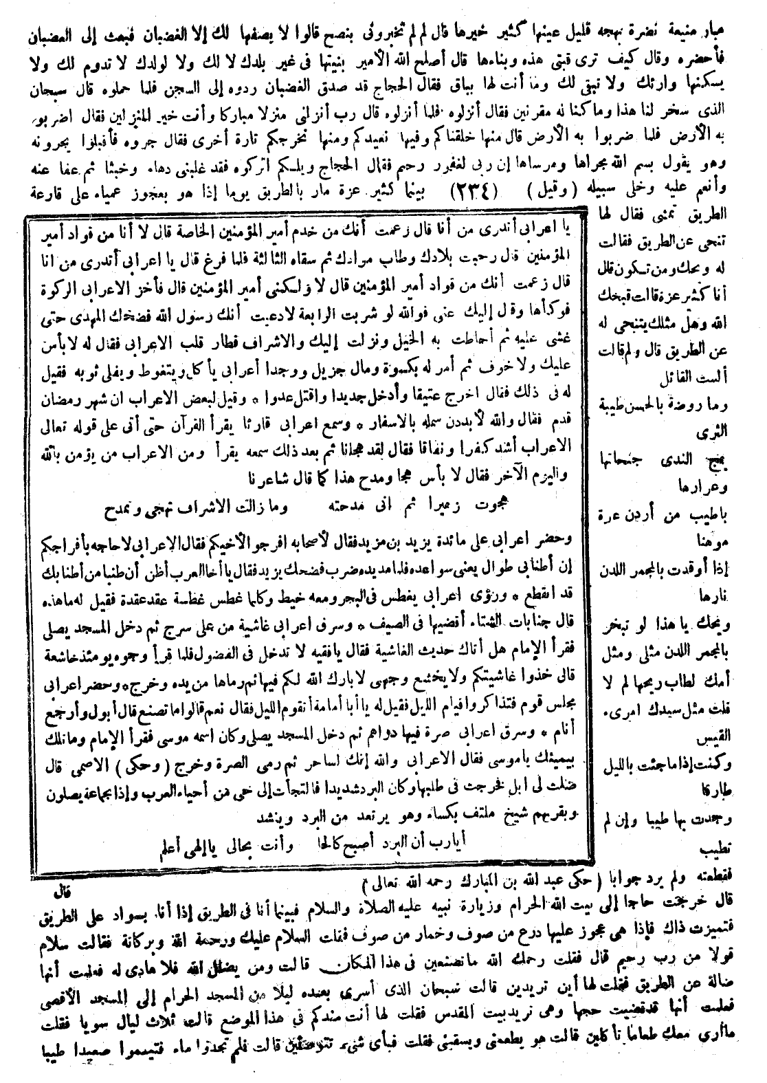 وحكى عبد الله بن المبارك رحمه الله تعالى، قال خرجت حاجاً إلى بيت الله الحرام وزيارة نبيه عليه الصلاة والسلام فبينما أنا في الطريق إذا أنا بسواد على الطريق فتميزت ذاك فإذا هي عجوز عليها درع من صوف وخمار من صوف فقلت السلام عليك ورحمة الله وبركاته فقالت سلام قولا من رب رحيم قال فقلت لها رحمك الله ما تصنعين في هذا المكان قالت ومن يضلل الله فلا هادي له فعلمت أنها ضالة عن الطريق فقلت لها أين تريدين قالت " سبحان الذي اسرى بعبده ليلا من المسجد الحرام إلى المسجد الأقصى " فعامت أنها قد قضت حجها وهي تريد بيت المقدس فقلت لها: أنت منذ كم في هذا الموضع؟ قالت: ثلاث ليال سويا. فقلت ما أرى معك طعاما تأكلين قالت: " هو يطعمني ويسقيني " فقلت: فبأي شيء تتوضئين. قالت: فإن لم تجدوا ماء فتيمموا صعيدا طيبا.