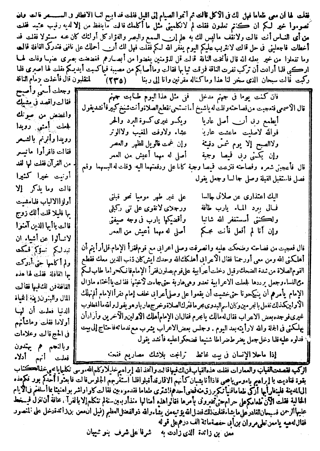 فقلت لها: إنّ معي طعام فهل لك في الأكل قالت ثم أتموا الصيام إلى الليل فقلت قد أبيح لنا الإفطار في السفر قالت وأن تصوموا خير لكم إن كنتم تعلمون لم لا تكلميني مثل ما أكلمك قالت: ما يلفظ من قول الا لديه رقيب عتيد فقلت فمن أي الناس أنت قالت ولا تقفُ ما ليس لك به علم إن السمع والبصر والفؤاد كل أولئك كان عنه مسئولا فقلت قد أخطأت فاجعليني في حل قالت لا تثريب عليكم اليوم يغفر الله لكم فقلت فهل لك أن أحملك على ناقتي فتدركي القافلة قالت وما تفعلوا من خير يعلمه الله قال فأنخت الناقة قالت قل للمؤمنين يغضوا من أبصارهم فغضضت بصري عنها وقلت لها اركبي فلما أرادت أن تركب نفرت الناقة فمزقت ثيابها فقالت وما أصابكم من مصيبة فبما كسبت أيديكم فقلت لها اصبري قالت سبحان الذي سخر لنا هذا وما كنا مقرنين وإنا إلى ربنا لمنقلبون قال فأخذت بزمام الناقة وجعلت أسعى وأصيح فقالت واقصد في مشيك واغضض من صوتك فجعلت أمشي رويدا رويدا وأترنم بالشعر فقالت فاقرأوا ما تيّسر من القرآن فقلت لها لقد أوتيت خيرا كثيرا قالت وما يذكّر إلا أولوا الألباب فلما مشيت بها قليلا قلت ألك زوج قالت يا أيها الذين آمنوا لا تسألوا عن أشياء إن تبدُ لكم تسؤكم فسكتُّ ولم أكلمها حتى أدركت بها القافلة فقلت لها هذه القافلة فمن لك فيها فقالت المال والبنون زينة الحياة الدنيا فعلمت أن لها أولاداً فقلت وما شأنهم في الحج قالت وعلامات وبالنجم هم يهتدون فعلمت أنهم أدلاء الركب فقصدت القباب والعمارات فقلت هذه القباب فمن لك فيها قالت واتخذ الله إبراهيم خليلا وكلم الله موسى تكليما يا يحيى خذ الكتاب بقوة فناديت يا إبراهيم يا موسى يا يحيى فإذا أنا بشبان كأنهم الأقمار قد اقبلوا فلما استقر بهم الجلوس قالت فابعثوا أحدكم بورقكم هذه إلى المدينة فلينظر أيها أزكى طعاما فليأتكم برزق منه فمضى أحدهم فاشترى طعاما فقدموه بين يدي فقالت كلوا واشربوا هنيئا بما أسلفتم في الأيام الخالية فقلت الآن طعامكم علي حرام حتى تخبروني بأمرها فقالوا هذه أمنا لها منذ أربعين سنة لم تتكلم إلا بالقرآن مخافة أن تزل فيسخط عليها الرحمن فسبحان القادر على ما يشاء فقلت ذلك فضل الله يؤتيه من يشاء والله ذو الفضل العظيم.
