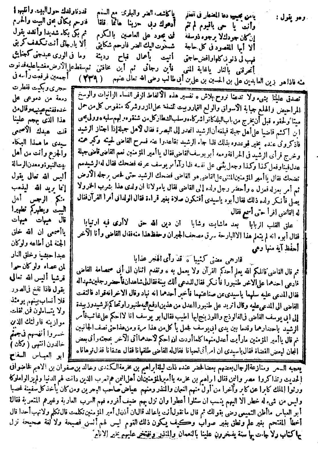 ثم سقط على الأرض مغشياً عليه فدنوت منه فإذا هو زين العابدين علي بن الحسين بن علي بن أبي طالب رضي الله تعالى عنهم أجمعين فرفعت رأسه في حجري وبكيت فقطرت دمعة من دموعي على خده ففتح عينيه وقال من هذا الذي يهجم علينا قلت عبدك الأصمعي سيدي ما هذا البكاء والجزع وأنت من أهل بيت النبوة ومعدن الرسالة أليس الله تعالى يقول: إنما يريد الله ليذهب عنكم الرجس أهل البيت ويطهركم تطهيراً قال: هيهات هيهات يا أصمعي إن الله خلق الجنة لمن أطاعه ولو كان عبداً حبشياً وخلق النار لمن عصاه ولو كان حراً قرشياً أليس الله تعالى يقول: فإذا نفخ في الصور فلا أنساب بينهم يومئذ ولا يتساءلون فمن ثقلت موازينه فأولئك هم المفلحون ومن خفت موازينه فأولئك الذين خسروا أنفسهم في جهنَّم خالدون انتهى.