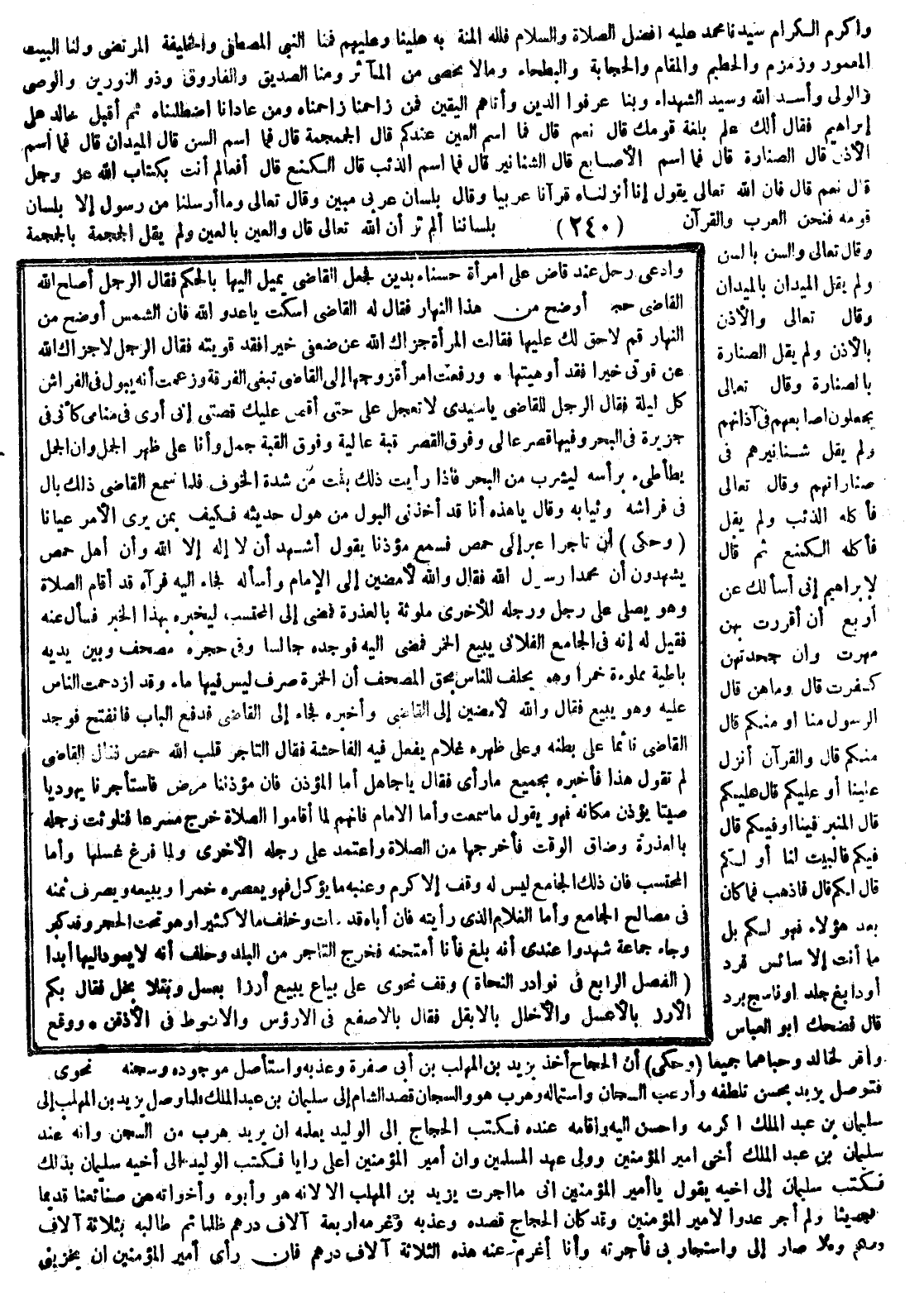 وأكرم الكرام سيدنا محمد عليه أفضل الصلاة والسلام فللَّه المنة به علينا وعليهم فمنا النبي المصطفى والخليفة المرتضى ولنا البيت المعمورة زمزم والحطيم والمقام والحجابة والبطحاء وما لا يحصى من المآثر ومنا الصديق والفاروق وذو النورين والوصي والولي وأسد الله وسيد الشهداء وبنا عرفوا الدين وأتاهم اليقين فمن زاحمنا زاحمناه ومن عادانا اضطلمناه ثم أقبل خالد على إبراهيم فقال ألك علم بلغة قومك قال نعم قال فما اسم العين عندكم قال الجمجمة قال فما اسم السن قال الميدن قال فما اسم الأذن قال الصنارة قال فما اسم الأصابع قال صنّاراتهم قال فما اسم الذئب قال الكنع قال أفعالهم أنت بكتاب الله عز وجل قال نعم فإن الله تعالى يقول: " إنا أنزلناه قرآناً عربيا " وقال: " بلسان عربي مبين " وقال تعالى: " وما أرسلنا من رسول إلا بلسان قومه " فنحن العرب والقرآن بلساننا أنزل ألم تر أنّ الله تعالى قال والعين بالعين ولم يقل والجمجمة بالجمجمة وقال تعالى والسن بالسن ولم يقل والميدن بالميدن وقال تعالى والأذن بالأذن ولم يقل الصنارة بالصنارة وقال تعالى يجعلون أصابعهم في آذانهم ولم يقل صنَّاراتهم في صنَّاراتهم وقال تعالى فأكله الذئب ولم يقل فأكله الكنع ثم قال لإبراهيم: أني أسألك عن أرعب أن أقررت بهن مهرت وإن جحدتهن كفرت فقال وما هن قال الرسول منا أو منكم قال منكم قال والقرآن أنزل علينا أو عليكم قال عليكم قال المنبر فينا أو فيكم قال فيكم قال فالبيت لنا أو لكم قال لكم فأذهب فما كان بعد هؤلاء فهو لكم بل ما أنت إلا سائس قرد أو دابغ جلد أو ناسج برد قال فضحك أبو العباس وأقر لخالد وحباهما جميعاً.