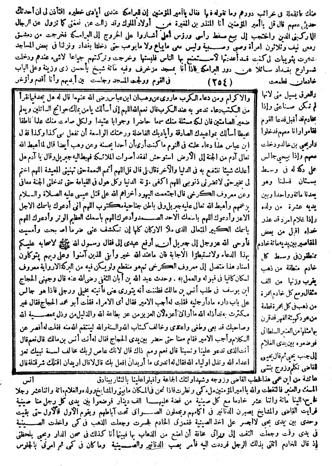 منك ما تفعله في خرائب دورهم وما تقوله فيها فقال يا أمير المؤمنين: إنَّ للبرامكة عندي أيادي خطيرة أفتأذن لي أن أحدثك حديثي معهم قال قل: قال يا أمير المؤمنين: أنا المنذر بن المغيرة من أولاد الملوك وقد زالت عني نعمتي كما تزول عن الرجال فلما ركبني الدين واحتجت إلى بيع مسقط رأسي ورؤوس أهلي أشاروا علي بالخروج إلى البرامكة فخرجت من دمشق ومعي نيف وثلاثون امرأة وصبي وصبية وليس معنا ما يباع ولا ما يوهب حتى دخلنا بغداد ونزلنا في بعض المساجد فدعوت بثويبات لي كنت قد أعددتها لأستمنح بها الناس فلبستها وخرجت وتركتهم جياعاً لا شيء عندهم ودخلت شوارع بغداد سائلاً عن دور البرامكة فإذا أنا بمسجد مزخرف وفيه مائة شيخ بأحسن زي وزينة وعلى الباب خادمان فطمعت في القوم وولجت المسجد وجلست بين أيديهم وأنا أقدم وأؤخر والعرق يسيل مني لأنها لم تكن صناعتي وإذا بخادم قد أقبل فدعا القوم فقاموا وأنا معهم فدخلوا دار يحيى بن خالد ودخلت معهم وإذا بيحيى جالس على دكة له في وسط بستان فسلمنا وهو يعدنا مائة وواحداً وبين يديه عشرة من ولده وإذا غلام أمرد قد عذر خداه أقبل من بعض المقاصير بين يديه مائة خادم ممنطقون في وسط كل خادم منطقة من ذهب يقرب وزنها من ألف مثقال ومع كل خادم مجمرة من ذهب في كل مجمرة قطعة من عود كهيئة الفهرقد قرن بها مثلها من الغنبر السلطاني فوضعوه بين يدي الغلام إلى جنب يحيى ثم قال يحيى للقاضي تكلم وزوّج بنتي عائشة من ابن عمي هذا فخطب القاضي وزوجه وشهد أولئك الجماعة وأقبلوا علينا بالنثار ببنادق المسك والعنبر فالتقطت والله يا أمير المؤمنين ملء كمي ونظرت فإذا نحن في المكان ما بيني والمشايخ وولده والغلام مائة واثنا عشر رجلا فخرج إلينا مائة واثنا عشر خادما مع كل خادم صينية من فضة عليها ألف دينار فوضعوا بين يدي كل رجل منا صينية فرأيت القاضي والمشايخ يصبون الدنانير في أكمامهم ويجعلون الصواني تحت آباطهم ويقوم الأول فالأول حتى بقيت وحدي بين يدي يحيى لا أجسر على أخذ الصينية فغمزني الخادم فجسرت وأخذتها وجعلت الذهب في كمي وأخذت الصينية في يدي وقمت وجعلت ألتفت إلى ورائي مخافة أن أمنع من الذهب به فبينما أنا كذلك في صحن الدار ويحيى يلحظني إذ قال للخادم ائتني بذلك الرجل فرددت إليه فأمر بصب الدنانير والصينية وما كان في كمي ثم أمرني بالجلوس