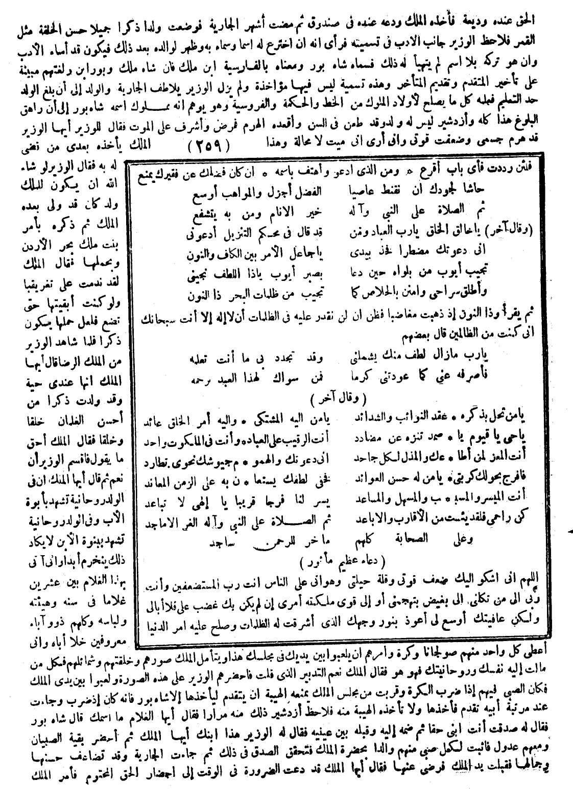 الحق عنده وديعة فأخذه الملك وأودعه عنده في صندوق ثم مضت أشهر فوضعت ولدا ذكراً جميلاً حسن الخلقة مثل القمر فلاحظ الوزير جانب الأدب في تسميته فرأى أنه إن إخترع له إسما وسماه به وظهر لوالده بعد ذلك فيكون قد أساء الأدب وإن هو تركه بلا إسم لم يتهيأ له ذلك فسماه شاه بور ومعناه بالفارسية ابن ملك فإن شاه ملك وبور ابن ولغتهم مبنية على تأخير المتقدم وتقديم المتأخر وهذه تسمية ليس فيها مؤاخذة ولم يزل الوزير يلاطف الجارية والولد إلى أن راهق البلوغ هذا كله وأزدشير ليس له ولد وقد طعن في السن وأقعده الهرم فمرض وأشرف على الموت فقال للوزير أيها الوزير قد هرم جسمي وضعفت قوتي وإني أرى إني ميت لا محالة وهذا الملك يأخذه بعدي من قضي له به فقال الوزير: لو شاء الله أن يكون للملك ولد كان قد ولي بعده الملك ثم ذكره بأمر بنت ملك الأردن وبحملها فقال الملك لقد ندمت على تغريقها ولو كنت أبقيتها حتى تضع فلعل حملها يكون ذكراً فلما شاهد الوزير
