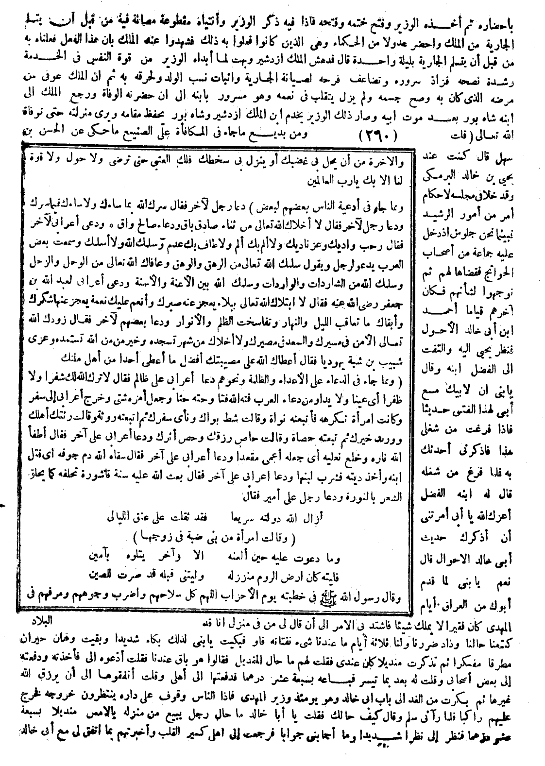 قلت ومن بديع ما جاء في المكافأة على الصنيع ما حكي عن الحسن بن سهل قال كنت عند يحيى بن خالد البرمكي وقد خلا في مجلسه لأحكام أمر من أمور الرشيد فبينما نحن جلوس إذ دخل عليه جماعة من أصحاب الحوائج فقضاها لهم ثم توجهوا لشأنهم فكان آخرهم قياما أحمد بن أبي خالد الأحول فنظر يحيى إليه والتفت إلى الفضل ابنه وقال يا بني: إن لأبيك مع أبي هذا الفتى حديثاً فإذا فرغت من شغلي هذا فأذكرني أحدثك به فلما فرغ من شغله قال له ابنه الفضل أعزك الله يا أبي أمرتني أن أذكرك حديث أبي خالد الأحول قال نعم يا بني لما قدم أبوك من العراق أيام المهدي كان فقيراً لا يملك شيئاً فاشتد بي الأمر إلى أن قال لي من في منزلي إنا قد كتمنا حالنا وزاد ضررنا ولنا ثلاثة أيام ما عندنا شيء نقتاته قال: فبكيت يا بني لذلك بكاء شديداً وبقيت ولهان حيران مطرقاً مفكراً ثم تذكرت منديلاً كان عندي فقلت لهم ما حال المنديل فقالوا هو باق عندنا فقلت أدعوه إلي فأخذته ودفعته إلى بعض أصحابي وقلت له بعه بما تيسر فباعه بسبعة عشر درهما فدفعتها إلى أهلي وقلت أنفقوها إلى أن يرزق الله غيرها ثم بكرت من الغد إلى باب أبي خالد وهو يومئذ وزير المهدي فإذا الناس وقوف على داره ينتظرون خروجه فخرج عليهم راكبا فلما رآني سلم علي وقال كيف حالك فقلت يا أبا خالد ما حال رجل يبيع من منزله بالأمس منديلاً بسبعة عشر درهما فنظر إلي نصراً شديداً وما أجابني جواباً فرجعت إلى أهلي كسير القلب وأخبرتهم بما اتفق لي مع أبي خالد