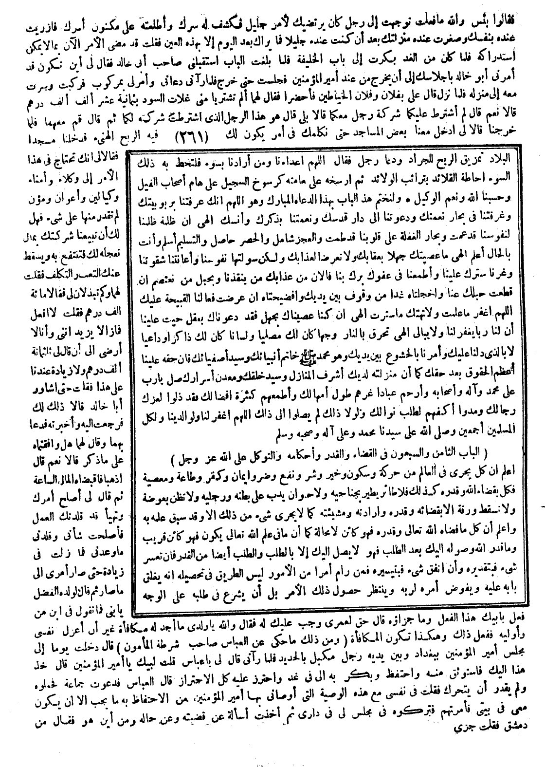 ومن ذلك ما حكي عن العباس صاحب شرطة المأمون قال: دخلت يوماً إلى مجلس أمير المؤمنين ببغداد وبين يديه رجل مكبل بالحديد فلما رآني قال لي يا عباس قلت لبيك يا أمير المؤمنين قال خذ هذا إليك فاستوثق منه واحتفظ وبكر به إلّي في غد واحترز عليه كل الاحتراز قال العباس فدعوت جماعة فحملوه ولم يقدر أن يتحرك فقلت في نفسي مع هذه الوصية التي أوصاني بها أمير المؤمنين من الإحتفاظ به ما يجب إلا أن يكون معي في بيتي فأمرتهم فتركوه في مجلس لي في داري ثم أخذت أسأله عن قضيته وعن حاله ومن أين هو فقال من دمشق فقلت جزى