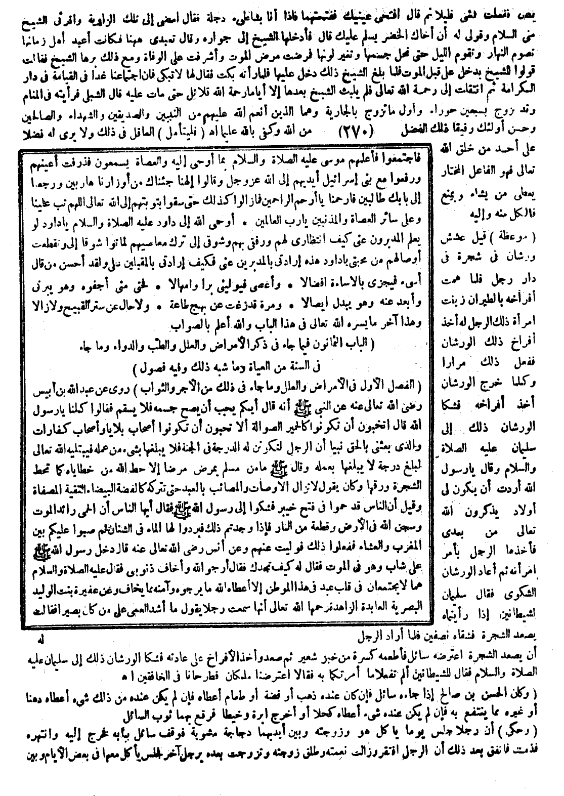 موعظة قيل عشش ورشان في شجرة في دار رجل فلما همت أفراخه بالطيران زينت امرأة ذلك الرجل له أخذ أفراخ ذلك الورشان ففعل ذلك مراراً وكلما خرج الورشان أخذ أفراخه فشكا الورشان ذلك إلى سليمان عليه الصلاة والسلام وقال يا رسول الله أردت أن يكون لي أولاد يذكرون الله تعالى من بعدي فأخذها الرجل بأمر امرأته ثم أعاد الورشان الشكوى فقال سليمان لشيطانين إذا رأيتماه يصعد الشجرة فشقاه نصفين فلما أراد الرجل أن يصعد الشجرة أعترضه سائل فأطعمه كسرة من خبز شعير ثم سعد وأخذ الأفراخ على عادته فشكا الورشان ذلك إلى سليمان عليه الصلاة والسلام فقال للشيطانين ألم تفعلا ما أمرتكما به فقالا اعترضنا ملكان فطرحانا في الخافقين.