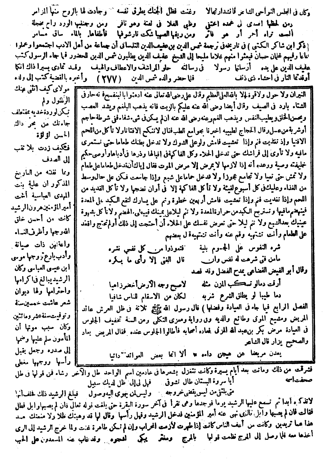 ومما نقلته من التاريخ المذكور أن علية بنت المهدي العباسية أخت أمير المؤمنين هارون الرشيد كانت من أحسن خلق الله وجها وأظرف النساء وأعقلهنَّ ذات صيانة وأدب بارع تزوجها موسى بن عيسى العباسي وكان الرشيد يبالغ في إكرامها واحترامها ولها ديوان شعر عاشت خمسين سنة وتوفيت سنة عشر ومائتين وكان سبب موتها أن المأمون سلم عليها وضمها إلى صدره وجعل يقبل رأسها ووجهها مغطى فشرقت من ذلك وماتت بعد أيام يسيرة وكانت تتغزل بشعرها في خادمين اسم الواحد طل والآخر رشاء فمن قولها في طل وصحفت اسمه: