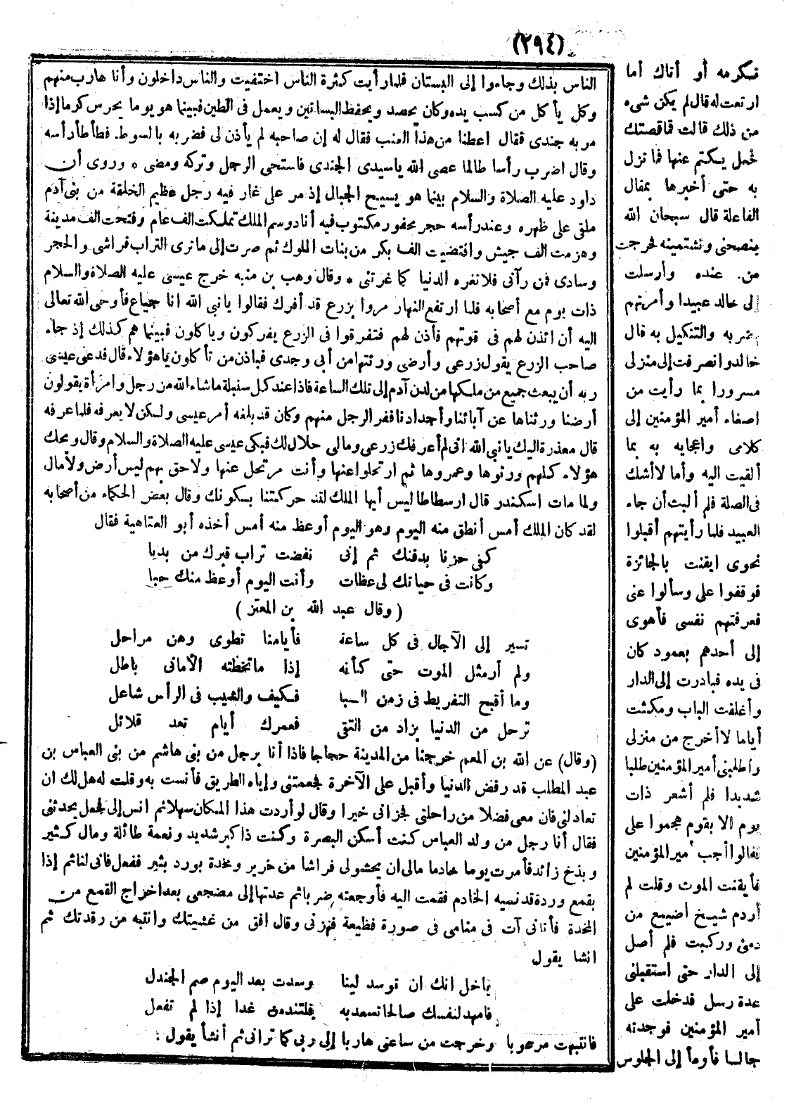 تكرهه أو أتاك أمر ارتعت له قال لم يكن شيء من ذلك قالت فما قصتك فجعل يكتم عنها فلم تزل به حتى أخبرها بمقالة خالد قالت فما قلت لابن الفاعلة قال سبحان الله ينصحني وتشتمينه فخرجت من عنده وأرسلت إلى خالد عبيدا وأمرتهم بضربه والتنكيل به قال خالد: وانصرفت إلى منزلي مسرورا بما رأيت من اصغاء أمير المؤمنين إلى كلامي وإعجابه بما ألقيت إليه وأنا لا أشك في الصلة فلم ألبث أن جاء العبيد فلما رأيتهم أقبلوا نحوي أيقنت بالجائزة فوقفوا علي وسألوا عني فعرفتهم نفسي فأهوى إليَّ أحدهم بعمود كان في يده فبادرت إلى الدار وأغلقت الباب ومكثت أياما لا أخرج من منزلي وطلبني أمير المؤمنين طلبا شديدا فلم اشعر ذات يوم إلا بقوم هجموا عليَّ فقالوا أجب أمير المؤمنين فأيقنت بالموت وقلت لم أردم شيخ اضيع من دمي وركبت فلم اصل إلى الدار حتى استقبلني عدة رسل فدخلت على أمير المؤمنين فوجدته جالسا فأومأ إلي بالجلوس