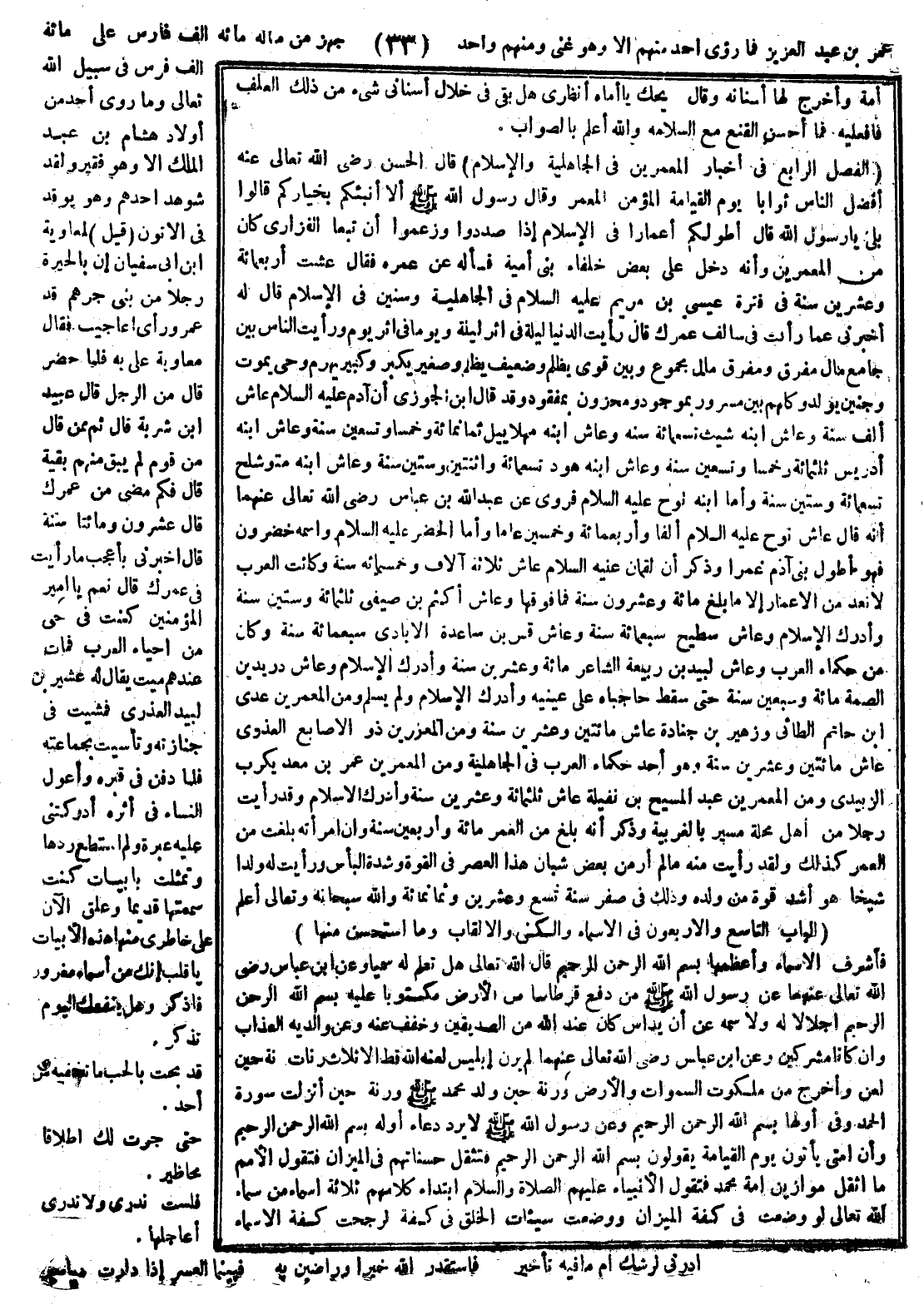 قيل لمعاوية ابن أبي سفيان إن بالحيرة رجلاً من بني جرهم قد عمّر ورأى أعاجيب فقال معاوية عليَّ به فلما حضر قال من الرجل قال عبيد بن شربة قال ثم ممن قال من قوم لم يبق منهم بقية قال فكم مضى من عمرك قال عشرين ومائتا سنة قال أخبرني بأعجب ما رأيت في عمرك قال نعم يا أمير المؤمنين كنت في حي من أحياء العرب فمات عندهم ميت يقال له عشير بن لبيد العذري فمشيت في جنازته وتأسيت بجماعته فلما دفن في قبره وأعول النساء في أثره أدركتني عليه عبرة ولم أستطع ردها وتمثلت بأبيات كنت سمعتها قديما وعلق الآن على خاطري منها هذه الأبيات: