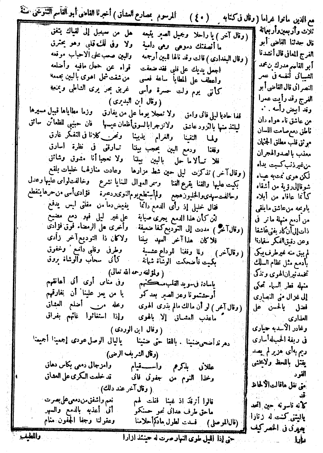 وقال في كتابه الموسوم بمصارع العشاق أخبرنا القاضي أبو القاسم التنوخي سنة ثلاثة وأربعين وأربعمائة قال حدثنا القاضي أبو الفرج المعافى قال أنشدنا أبو القاسم مدرك بن محمد الشيباني لنفسه في عمرو النصراني قال القاضي أبو الفرج وقد رأيت عمراً وقد أبيض رأسه: