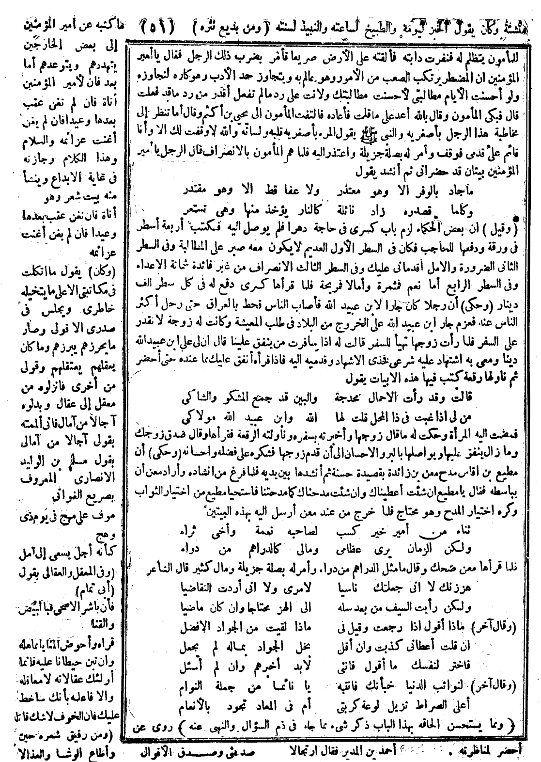 وكان يقول ما اتكلت في مكاتيبي إلا على ما يتخيله خاطري ولا يجلس في صدري إلا قولي وصار ما يحرزهم يبرزهم وما كان يعقلهم يعتقلهم وقولي من أخرى فانزلوه من معقل إلى عقال وبدلوه آجالا من آمال فإني ألممته بقولي آجالا من آمال بقول مسلم بن الوليد الإنصاري المعروف بصريع الغواني:
