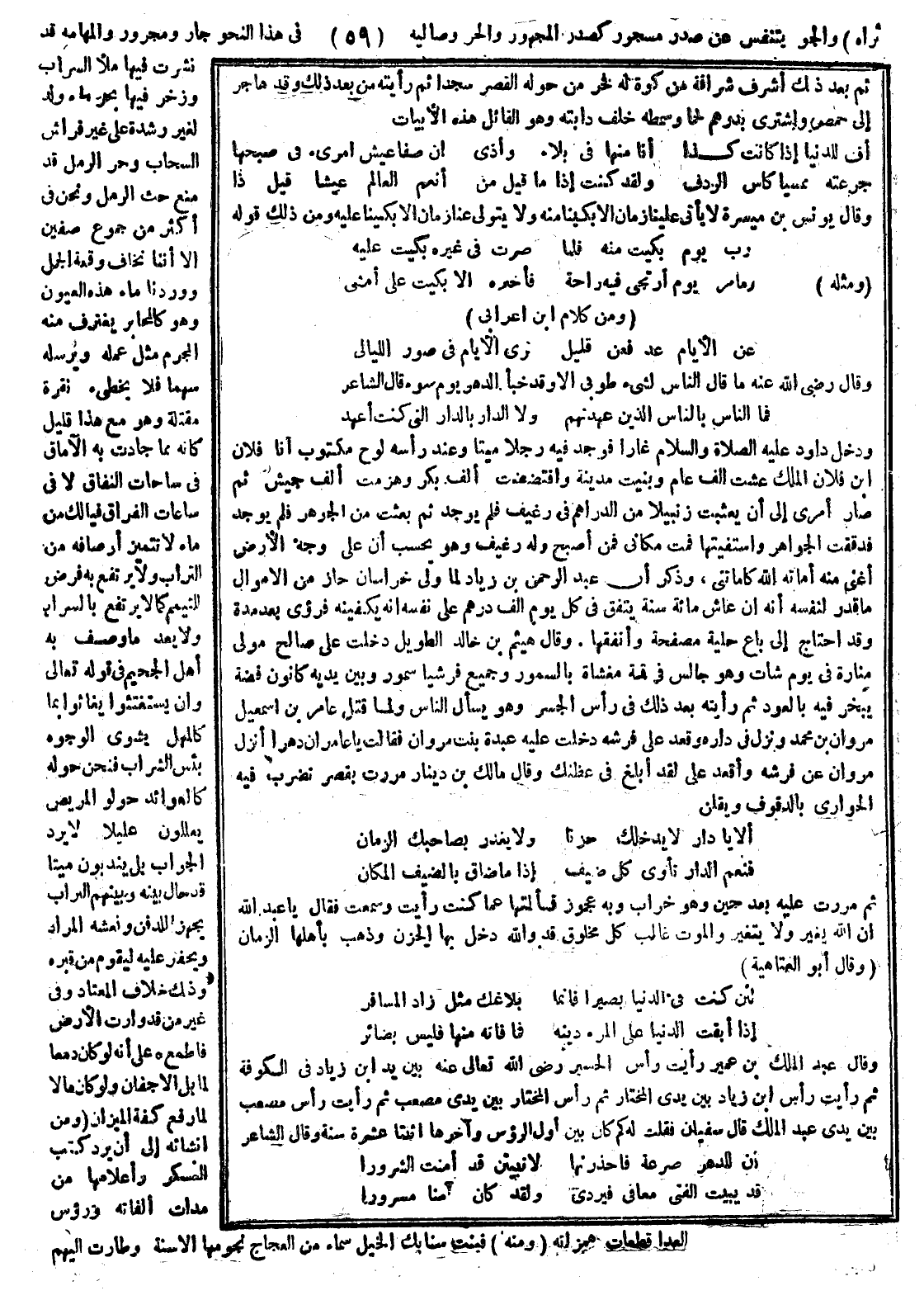 ثراه والجو يتنفس عن صدر مسجور كصدر المهجور، والحر وصاليه في هذا النحو جار ومجرور، والمهامه قد نشرت فيها ماء السراب، وزخرفيها بحر ماء ولد لغير رشدة على غير فراش السحاب، وحر الرمل قد منع حث الرمل، ونحن في أكثر من جموع صفين إلا أننا نخاف وقعة الجمل، ووردنا ماء هذه العيون وهو كالمحابر، يغترف منه المجرم مثل عمله ويرسله سهما فلا يخطىء نقرة مقتله، وهو مع هذا قليل كأنه مما جادت به الآماق في ساحات النفاق لا في ساعات الفراق فيا لك من ماء لا تتميز أوصافه من التراب ولا يرتفع به فرض التيُّمم كما لا يرتفع بالسراب، ولا يعد ما وصف به أهل الجحيم في قوله تعالى وإن يستغيثوا يغاثوا بماء كالمهل يشوي الوجوه بئس الشراب، فنحن حوله كالعوائد حول المريض يعللون عليلا لا يرد الجواب، بل يندبون ميتا قد حال بينه وبينهم التراب، يجهز للدفن ونعشه المراد ويحفر عليه ليقوم من قبره وذلك خلاف المعتاد. وفي غير من قد وارت الأرض فاطمع. على أنه لو كان دمعا لما بلّ الأجفان، ولو كان مالا لما رفع كفة الميزان.