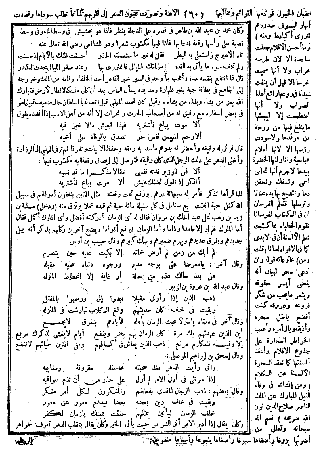 ومنه وما أحسب الأقلام جعلت ساجدة إلا لأن طرسه محراب، ولا أنها سميت خرسا إلا قبل أن ينفث سيدنا في روعها رائع هذا الصواب، ولا أنها اضطجعت إلا ليبعثها ما ينفخ فيها من روحه من مرقدها، ولا سودت رؤوسها إلا لأنها أعلام عباسية وتناولتها الحضرة بيدها، لا جرم أنها تحامي الحمى وتسفك دما وتحقن دما وتتشيح بها يده عنانا وترسلها، فتعلم الفرسان أن في الكتاب لفرسانا، وتقوم الخطباء بما كتبت تعلم الألسنة أن في الأيدي كما في الأفواه لسانا.