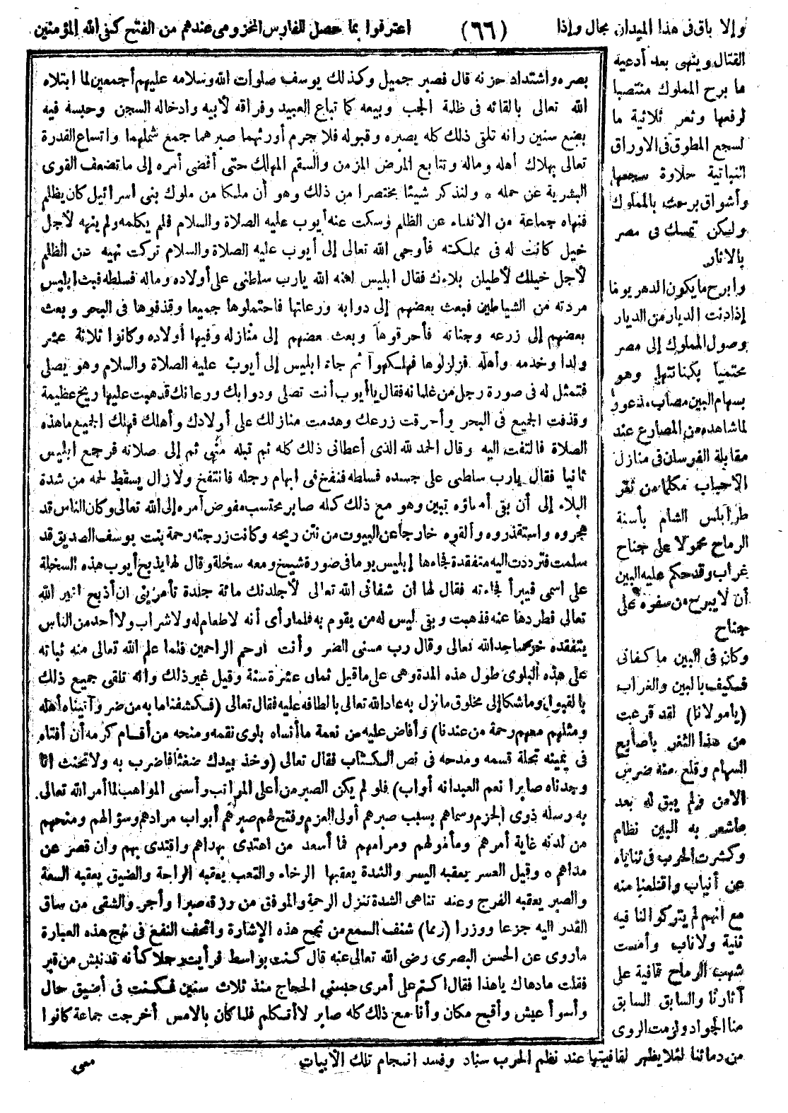والأباق في هذا الميدان مجال، وإذا اعترفوا بما حصل للفارس المخزومي عندهم من الفتح كفى الله المؤمنين القتال، وينهى بعد أدعية ما برح المملوك منتصباً لرفعها، وثغر ثلاثية ما لسجع المطوق في الأوراق النباتية حلاوة سجعها، واشواق برحت بالمملوك ولكن تمسك في مصر بالآثار.