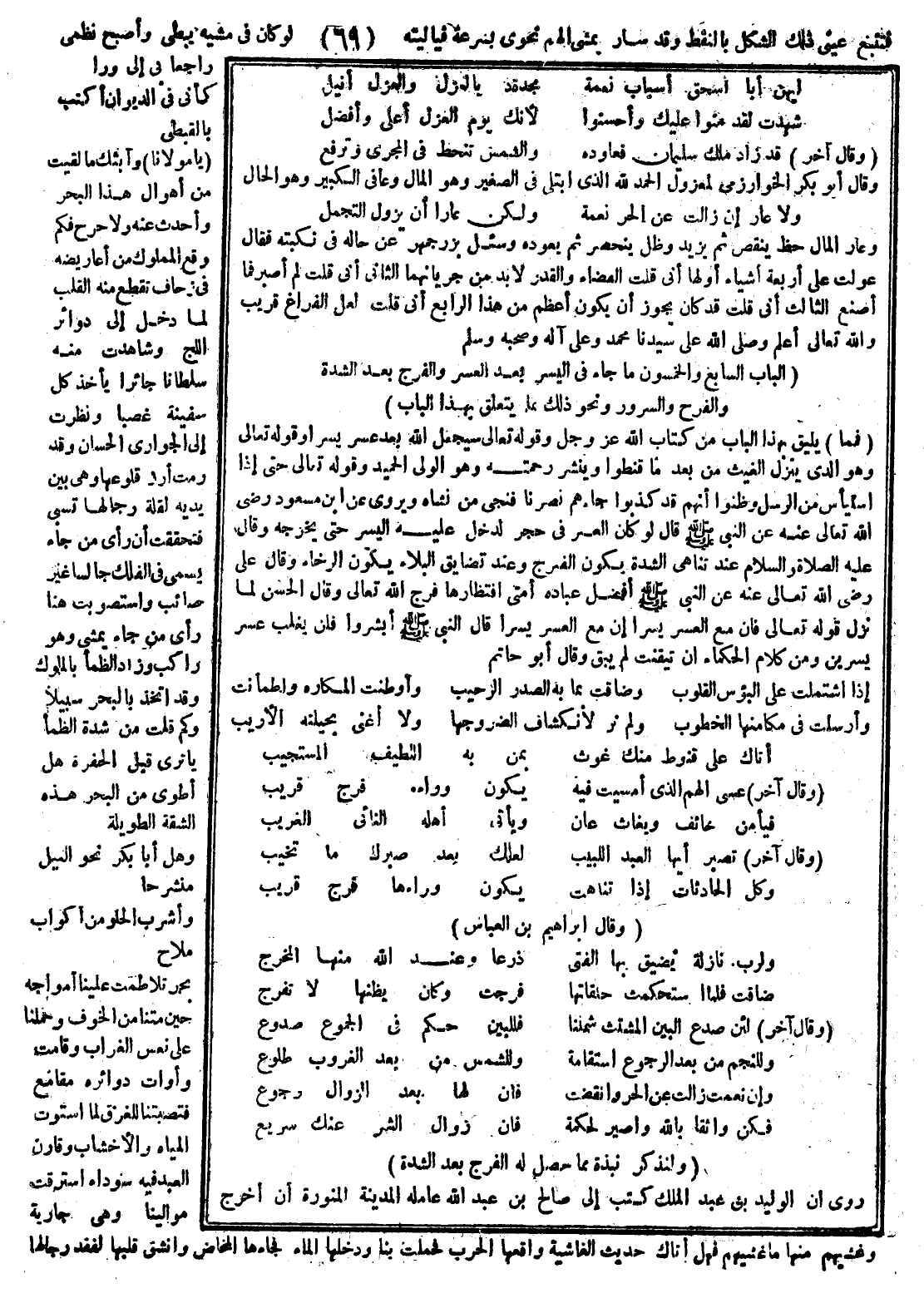 يا مولانا وأبثك ما لقيت من أهوال هذا البحر وأحدث عنه ولا حرج، فكم وقع المملوك في أعاريضه في زحافٍ تقطّع منه القلب لما دخل إلى دوائر اللجّ، وشاهدت منه سلطاناً جائراً يأخذ كل سفينة غصباً، ونظرت إلى الجواري الحسان وقد رمت أزر قلوعها وهي بين يديه لقلة رجالها تسبي، فتحققت أن رأى من رجاء يسمى في الفلك جالساً غير صائب، واستصوبت هنا رأي من جاء يمشي وهو راكب، وزاد الظمأ بالمملوك وقد أتخذ بالبحر سبيلاً، وكم قلت من شدة الظمأ يا ترى قبل الحفرة هي أطوي من البحر هذه الشقة الطويلة.