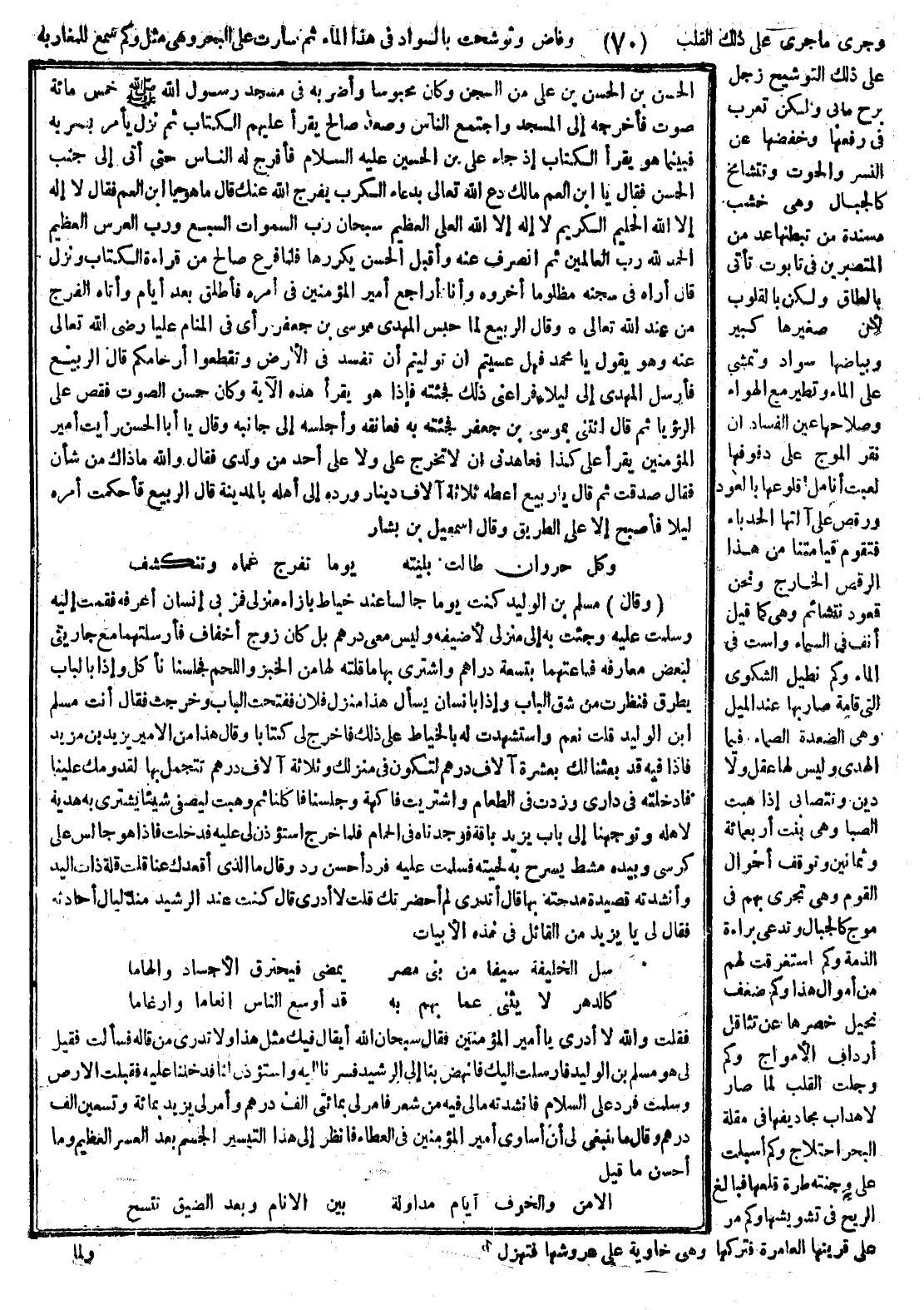 وجرى ما جرى على ذلك القلب وفاض، وتوشحت بالسواد في هذا الماء ثم سارت على البحر وهي مثل، كم سمع للمغاربة على ذلك التوشيح زجل، برح ما بين ولكن تعرب في رفعها وخفضها عن النسر والحوت، وتتشامخ كالجبال وهي خشب مسندة من تبطنها عدَّ من المتصبرين في تابوت، تأتي بالطباق ولكن بالقلوب لأن صغيرها كبير وبياضها سواد، وتمشي على الماء وتطير مع الهواء وصلاحها عين الفساد، إن نقر الموج على دفوفها لعبت أنامل قلوعها بالعود، ورقص على آلتها الحدباء فتقوم قيامتنا من هذا الرقص الخارج ونحن قعود، نتشامم وهي كما قيل أنف في السماء وإست في الماء، وكم نطيل الشكوى إلى قامة صاريها عند الميل وهي الصعدة الصماء، فيها الهدى وليس لها عقل ولا دين، وتتصابى إذا هبت للصبا وهي بنت أربعمائة وثمانين، وتوقف أحوال القوم وهي تجري بهم في موج كالجبال، وتدعي براءة الذمة وكم استغرقت لهم من أموال، هذا وكم ضعف نحيل خصرها عن تثاقل أرداف الأمواج، وكم وجلت القلوب لما صار لأهداب مجاديفها في مقلة البحر احتلاج، وكم أسبلت على وجنته طرة قلعها فبالغ الريح في تشويشها، وكم مر على قريتها العامرة فتركها وهي خاوية على عروشها، تتعاضم فتهزل