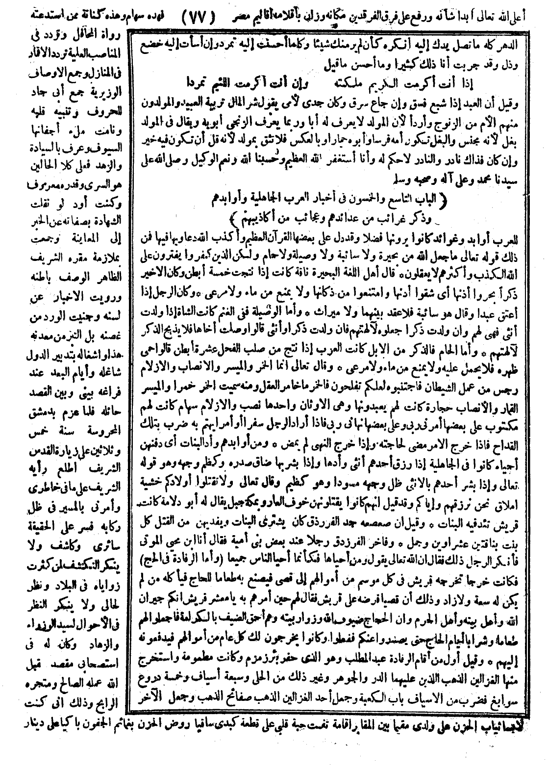 فلما عزم بدمشق المحروسة سنة خمس وثلاثين على زيارة القدس الشريف اطلع رأيه الشريف على ما في خاطري، وأمرني بالمسير في ظل ركابه فسر على الحقيقة سائري، وكاشف ولاينطر التكشف لمن كثرت زواياه في البلاد، ونظر لحالي ولا ينكر النظر في الأحوال لسيد الوزراء والزهاد، وكان له في استصحابي مقصد تقبل الله عمله الصالح ومتجره الرابح، ذلك أني كنت لابساً ثياب الحزن على ولدي، مقيما بين المقابر إقامة تفتت حبة قلبي على قطعة كبدي، ساقياً روض الحزن بغمائم الجفون، باكياً على دينار