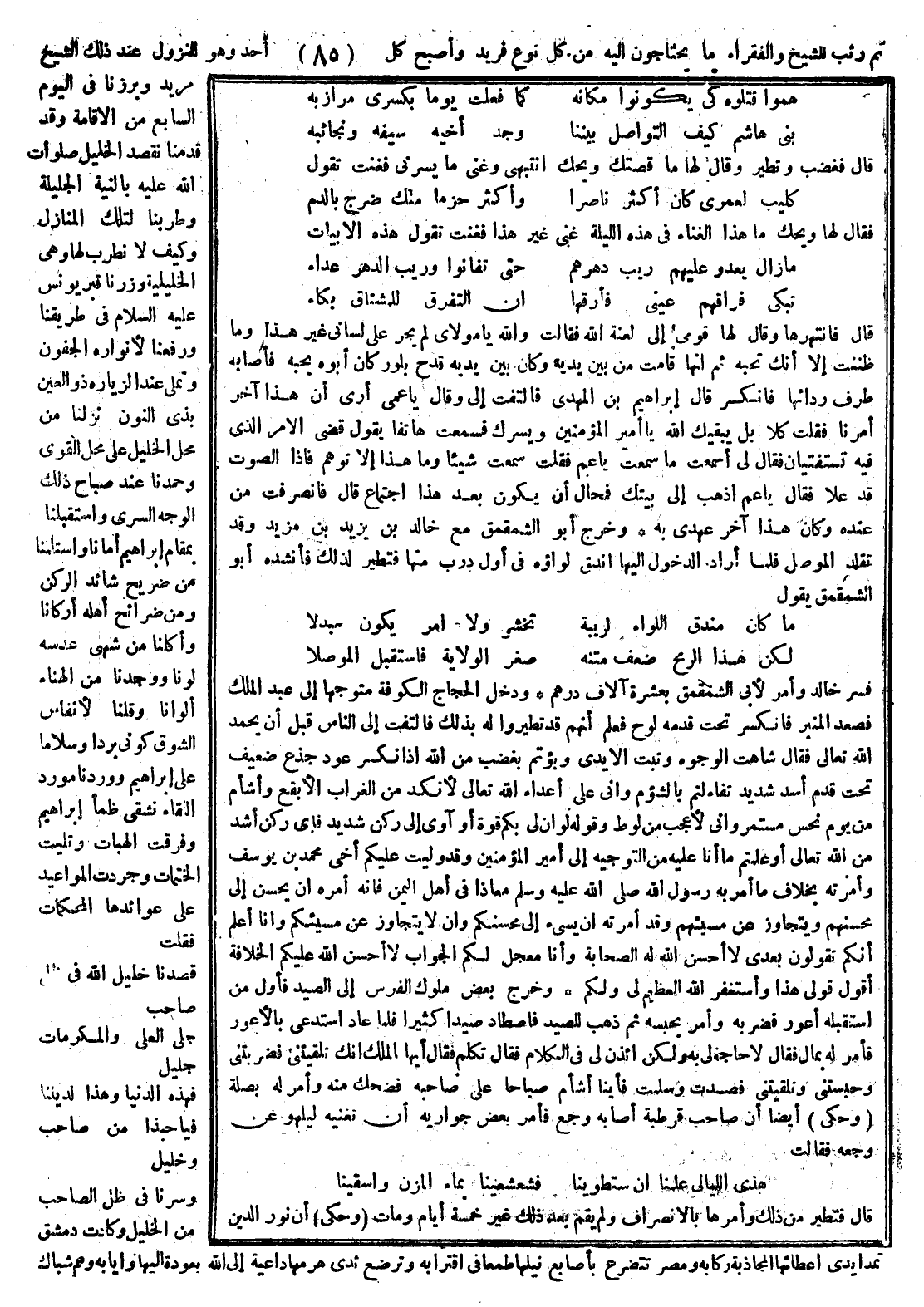 ثم رتب للشيخ والفقراء ما يحتاجون إليه من كل نوع فريد، واصبح كل أحد وهو للنزول عند ذلك الشيخ مُريد، ورزنا في اليوم السابع من الإقامة وقد قدمنا نقصد الخليل صلوات الله عليه بالنية الجلية، وطربنا لتلك المنازل وكيف لا نطرب لها وهي الخليلية، وزرنا قبر يونس عليه السلام في طريقنا ورفعنا لأنواره الجفون، وتملّى عند الزيارة ذو العين بذي النون، ثم نزلنا من محل الخليل على محل القوي، وحمدنا عند صباح ذلك الوجه السّري، واستقبلنا بمقام إبراهيم أمانا، واستلمنا من ضريح شائد الركن ومن ضرائح أهله أركانا، وأكلنا من شهي عدسه لونا ووجدنا من الهناء ألوانا، وقلنا لأنفاس الشوق كوني بردا وسلاما على إبراهيم، ووردنا مورد اللقاء تشفي ظمأ إبراهيم، وفرقت الهبات، وتليت الختمات، وجردت المواعيد على عوائدها المحكمات، فقلت: