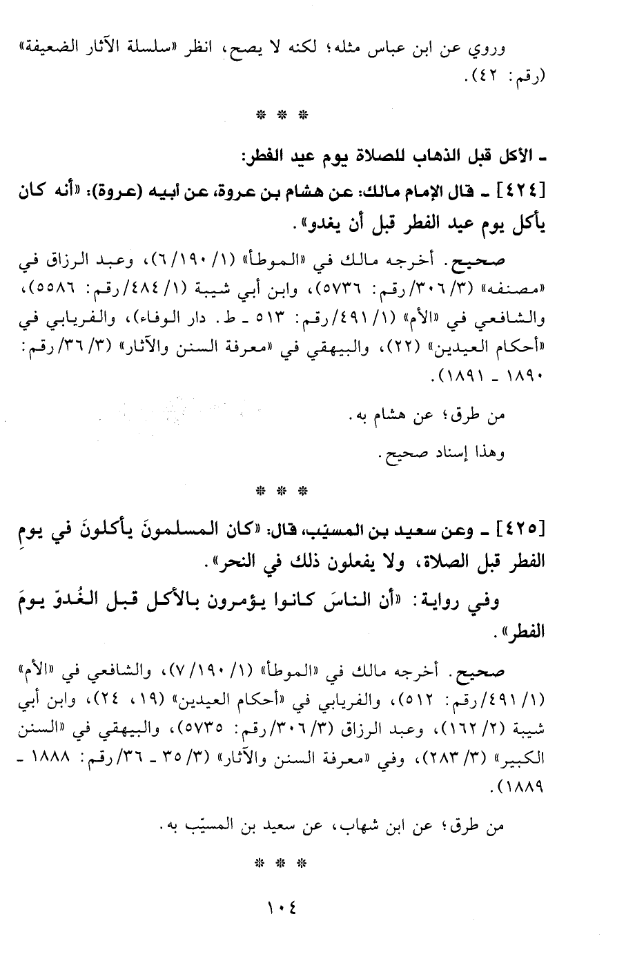 424 - قال الإمام مالك: عن هشام بن عروة، عن أبيه (عروة): "أنه كان يأكل يوم عيد الفطر قبل أن يغدو".