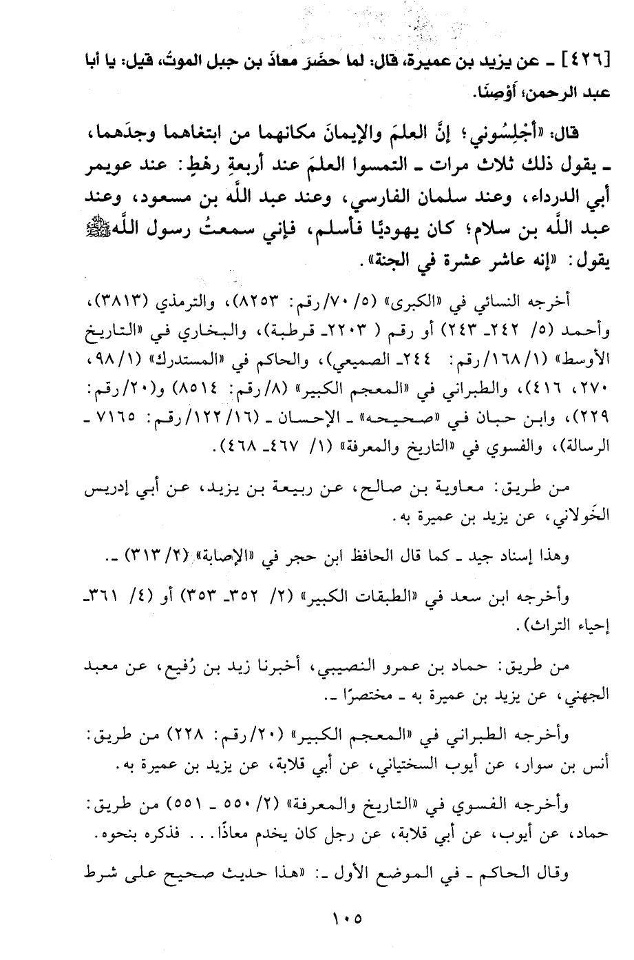 426 - عن يزيد بن عميرَة، قال: لما حضَرَ معاذَ بن جبل الموتُ، قيل يا أبا عبد الرحمن، أَوْصِنَا.
