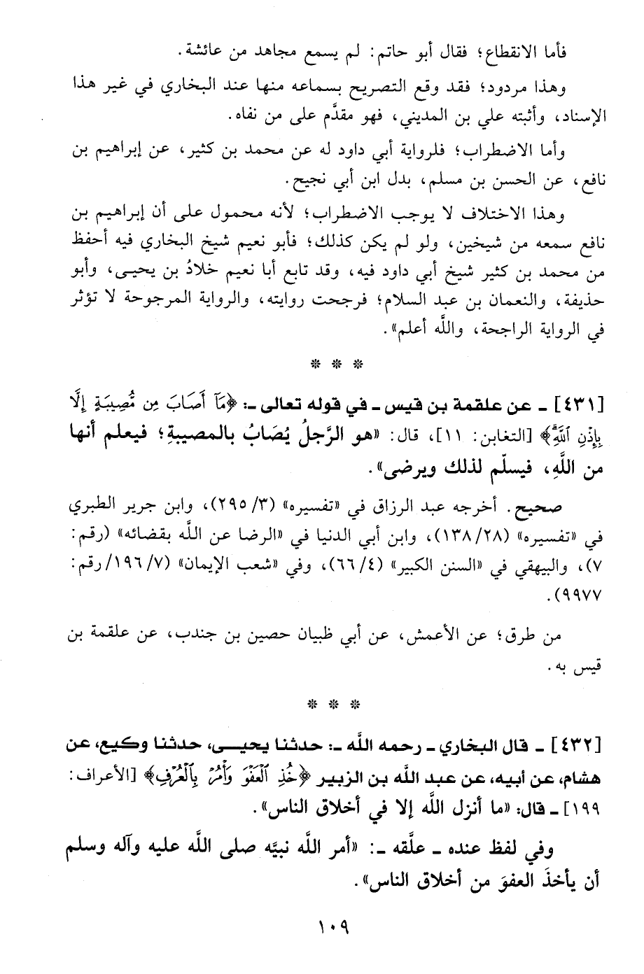 431 - عن علقمة بن قيس -في قوله تعالى-: {مَا أَصَابَ مِنْ مُصِيبَةٍ إِلَّا بِإِذْنِ اللهِ} [التغابن: 11]، قال: "هو الرَّجلُ يُصَابُ بالمصيبةِ، فيعلم أنها من اللهِ، فيسلّم لذلك ويرضى".