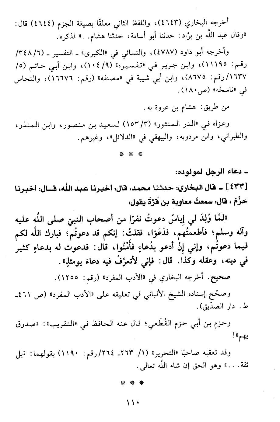 433 - قال البخاري: حدثنا محمد، قال: أخبرنا عبد الله، قال: أخبرنا حَزْم، قال: سمعت معاوية بن قُرَّةَ يقول: