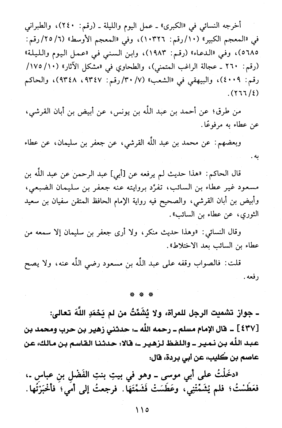 وقال النسائي: "وهذا حديث منكر، ولا أرى جعفر بن سليمان إلا سمعه من عطاء بن السائب بعد الإختلاط".