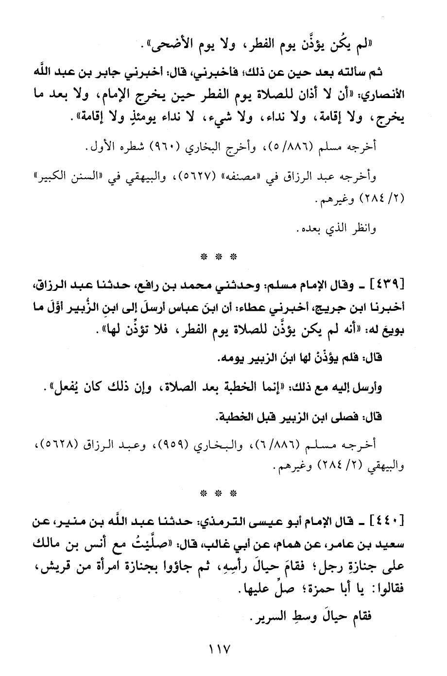439 - وقال الإمام مسلم: وحدثني محمد بن رافع، حدثنا عبد الرزاق، أخبرنا ابن جريج، أخبرني عطاء: أن ابنَ عباس أرسلَ إلى ابن الزُّبير أوَّلَ ما بويعَ له: "أنه لم يكن يؤذَّن للصلاة يوم الفطر، فلا تؤذِّن لها".