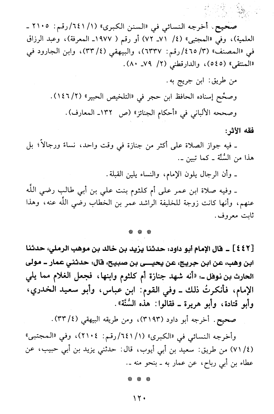 442 - قال الإمام أبو داود: حدثنا يزيد بن خالد بن موهب الرملي، حدثنا ابن وهب، عن ابن جريج، عن يحيى بن صبيح، قال: حدثني عمار -مولى الحارث بن نوفل-: "أنه شهد جنازة أم كلثوم وابنها، فجعل الغلام مما يلي الإمام، فأنكرتُ ذلك -وفي القوم: ابن عباس، وأبو سعيد الخدري، وأبو قتادة، وأبو هريرة- فقالوا: هذه السُّنَّة".