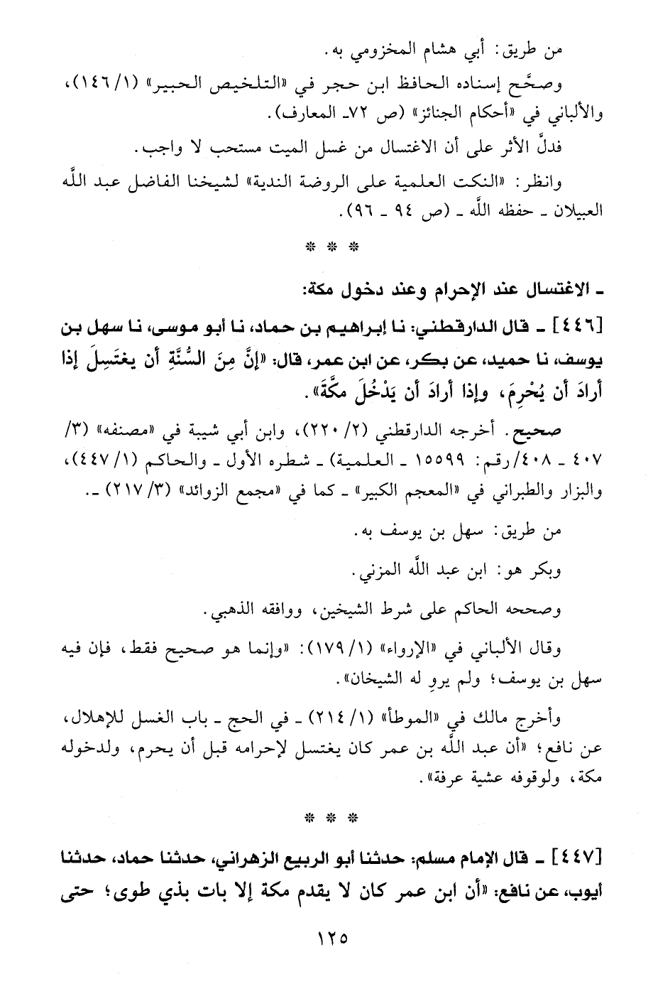 446 - قال الدارقطني: نا إبراهيم بن حماد، نا أبو موسى، نا سهل بن يوسف، نا حميد، عن بكر، عن ابن عمر، قال: "إنَّ مِنَ السُّنَّةِ أن يغتَسِلَ إذا أرادَ أن يُحْرِمَ، وإذا أرادَ أن يَدْخُلَ مكَةَ".
