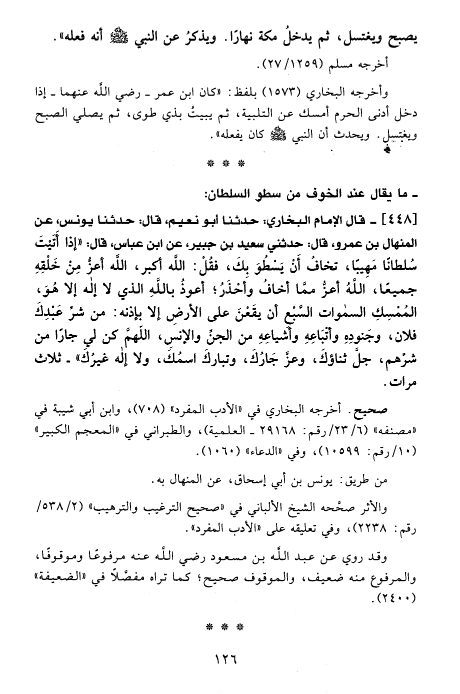 448 - قال الإمام البخاري: حدثنا أبو نعيم، قال: حدثنا يونس، عن المنهال بن عمرو، قال: حدثني سعيد بن جبير، عن ابن عباس، قال: "إذا أَتَيْتَ سُلطانًا مَهِيبًا، تخافُ أَنْ يَسْطُوَ بكَ، فقُلْ: الله اكبر، الله أعزُّ مِنْ خَلْقِهِ جميعًا، اللهُ أعزُّ ممَّا أخافُ وَأحْذَرُ، أعوذُ باللهِ الذي لا إله إلا هُوَ، المُمْسِكِ السموات السَّبْع أن يقَعْنَ على الأبيضِ إلا بإذنه: من شرِّ عَبْدِكَ فلان، وجَنودِهِ وأتْبَاعِهِ وأَشياعِهِ من الجن والإنسِ، اللَّهمَّ كن لي جارًا من شرِّهم، جلَّ ثناؤكَ، وعزَّ جَارُكَ، وتباركَ اسمُكَ، ولا إله غيرُكَ"- ثلاث مرات.