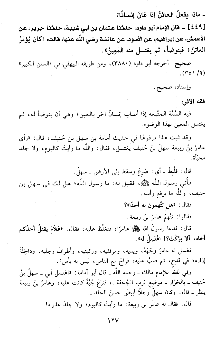 449 - قال الإمام أبو داود: حدثنا عثمان بن أبي شيبة، حدثنا جرير، عن الأعمش، عن إبراهيم، عن الأسود، عن عائشة - رضي الله عنها -، قالت: "كان يُؤمَرُ العائنُ؛ فيتوضأ، ثم يغتسل منه المَعِينُ".