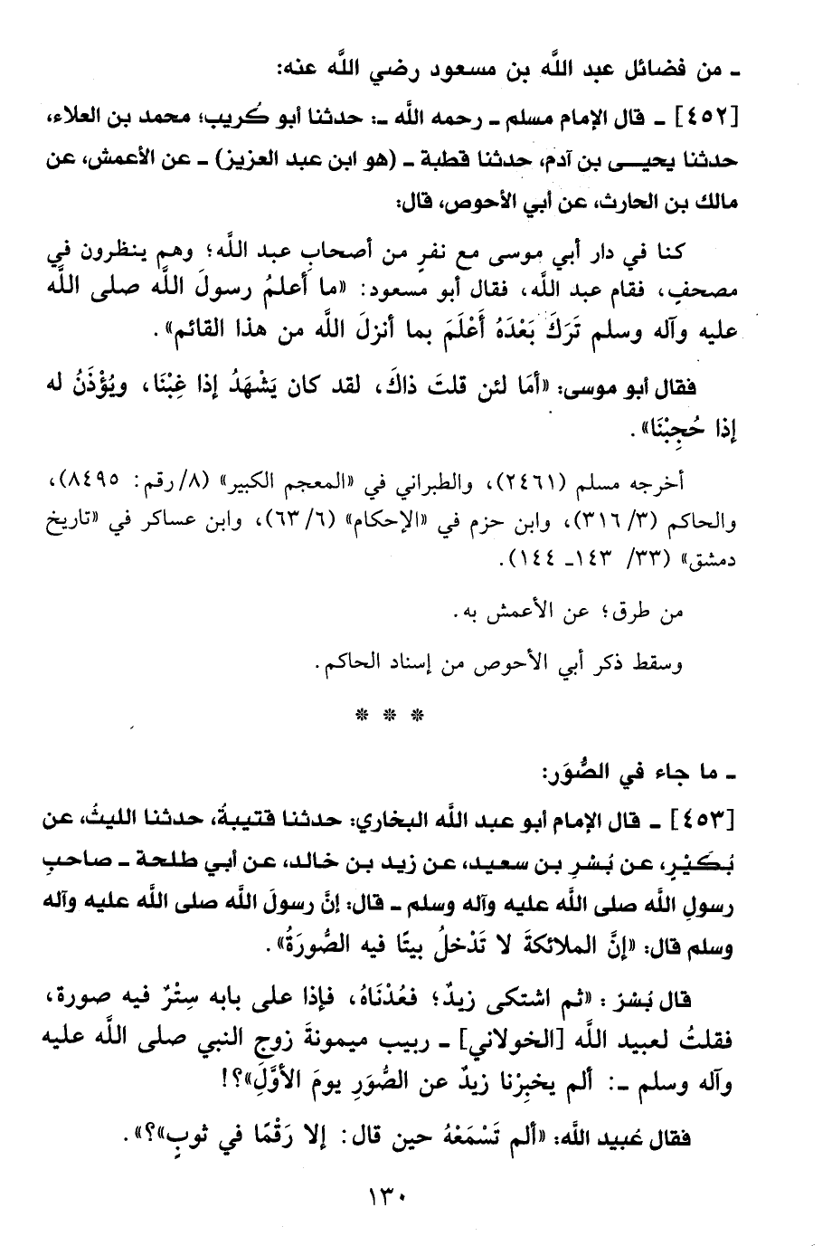 453 - قال الإمام أبو عبد الله البخاري: حدثنا قتيبةُ، حدثنا الليثُ، عن بُكَيْرٍ، عن بُسْرِ بن سعيد، عن زيد بن خالد، عن أبي طلحة -صاحبِ رسولِ الله - صلى الله عليه وآله وسلم - قال: إنَّ رسولَ الله - صلى الله عليه وآله وسلم - قال: "إنَّ الملائكةَ لا تَدْخلُ بيتًا فيه الصُّورَةُ".