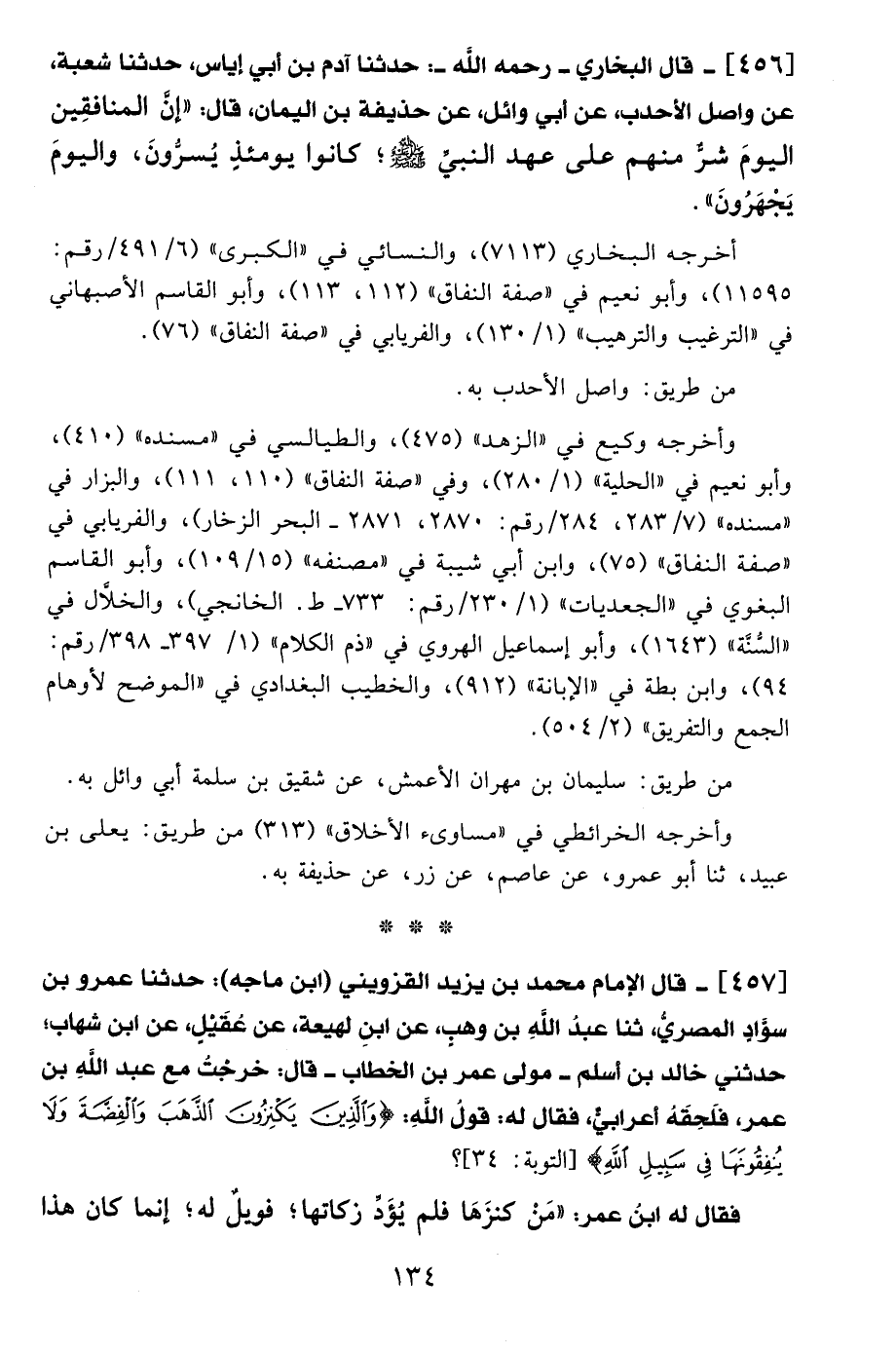 456 - قال البخاري -رَحِمَهُ اللهُ-: حدثنا آدم بن أبي إياس، حدثنا شعبة، عن واصل الأحدب، عن أبي وائل، عن حذيفة بن اليمان، قال: "إنَّ المنافقِين اليومَ شرٌّ منهم على عهد النبيِّ - صلى الله عليه وسلم -، كانوا يومئذٍ يُسرُّونَ، واليومَ يَجْهَرُونَ".