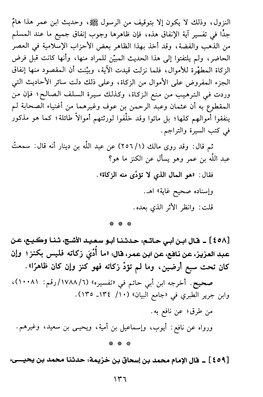 458 - قال ابن أبي حاتم: حدثنا أبو سعيد الأشج، ثنا وكيع، عن عبد العزيز، عن نافع، عن ابن عمر، قال: "ما أُدِّيَ زكاته فليس بكنز؛ وإن كان تحت سبع أرضين، وما لم تؤدِّ زكاته فهو كنز وإن كان ظاهرًا".