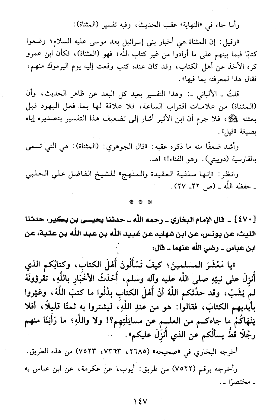 قلتُ -الألباني-: وهذا التفسير بعيد كل البعد عن ظاهر الحديث، وأن (المثناة) من علامات اقتراب الساعة، فلا علاقة لها بما فعل اليهود قبل بعثته - صلى الله عليه وسلم -، فلا جرم أن ابن الأثير أشار إلى تضعيف هذا التفسير بتصديره إياه بصيغة "قيل".