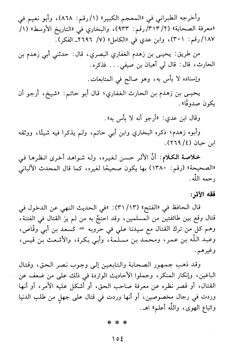 وقد ذهب جمهور الصحابة والتابعين إلى وجوب نصر الحق، وقتال الباغين، وإنكار المنكر، وحملوا الأحاديث الواردة في ذلك على من ضعف عن القتال، أو قصر نظره عن معرفة صاحب الحق، أو أشكل عليه الأمر، أو أنها وردت في رجال مخصوصين، أو أنها وردت في قتال على جهلٍ من طلب الدنيا واتباع الهوى، والله أعلم" اهـ.