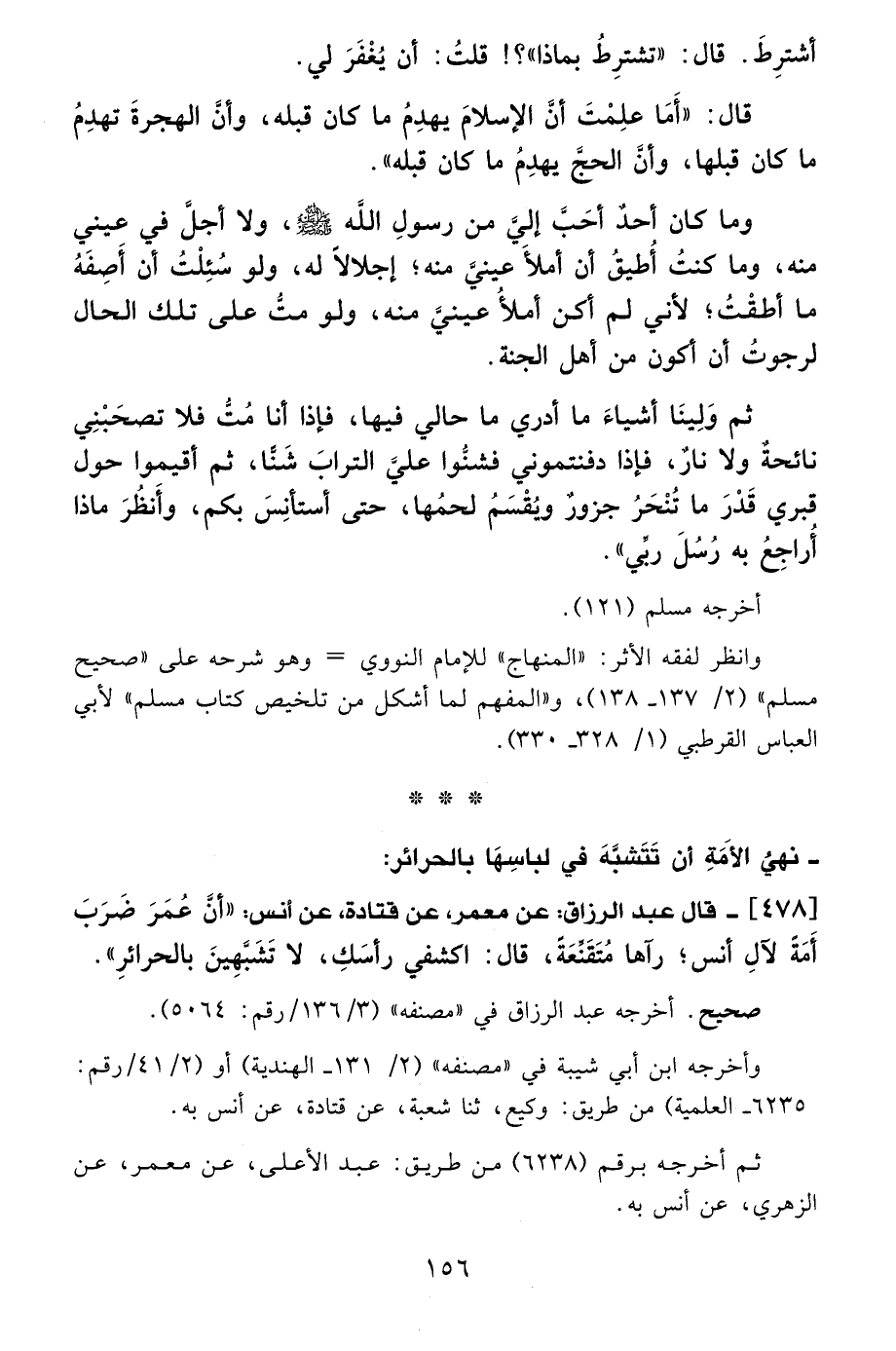 قال: "أَمَا علِمْتَ أنَّ الإسلامَ يهدِمُ ما كان قبله، وأنَّ الهجرةَ تهدِمُ ما كان قبلها، وأنَّ الحجَّ يهدِمُ ما كان قبله".