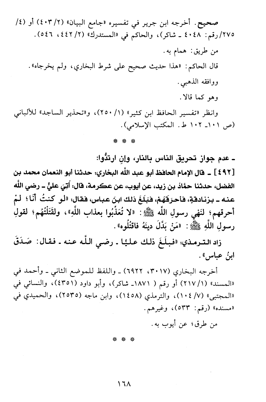 492 - قال الإمام الحافظ أبو عبد الله البخاري: حدثنا أبو النعمان محمد بن الفضل، حدثنا حمَّادُ بن زيد، عن أيوب، عن عكرمة، قال: أُتِيَ عليٌّ - رضي الله عنه- بزنادقةٍ، فأحرَقَهُمْ، فبَلَغَ ذلك ابنَ عباس، فقال: "لو كنتُ أنا؛ لَمْ أحرقهم؛ لنَهْي رسولِ الله - صلى الله عليه وسلم -: "لا تُعَذِّبُوا بعذاب اللهِ"، ولقَتَلْتُهُم؟ لقولِ رسولِ اللهِ - صلى الله عليه وسلم -: "مَنْ بَدَّلَ دينَهُ فاقتُلُوه".