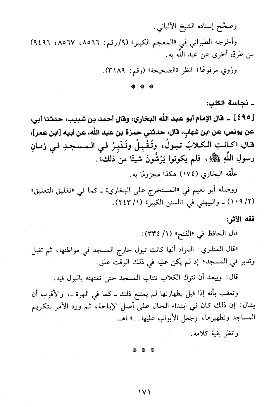 495 - قال الإمام أبو عبد الله البخاري: وقال أحمد بن شبيب: حدثنا أبي، عن يونس، عن ابن شهاب، قال: حدثني حمزة بن عبد الله، عن أبيه [ابن عمر]، قال: "كانتِ الكلابُ تبولُ، وتُقْبلُ وتُدْبِرُ في المسجدِ في زمانِ رسولِ اللهِ - صلى الله عليه وسلم -، فلم يكونوا يَرُشُّون شيئًا من ذلك".
