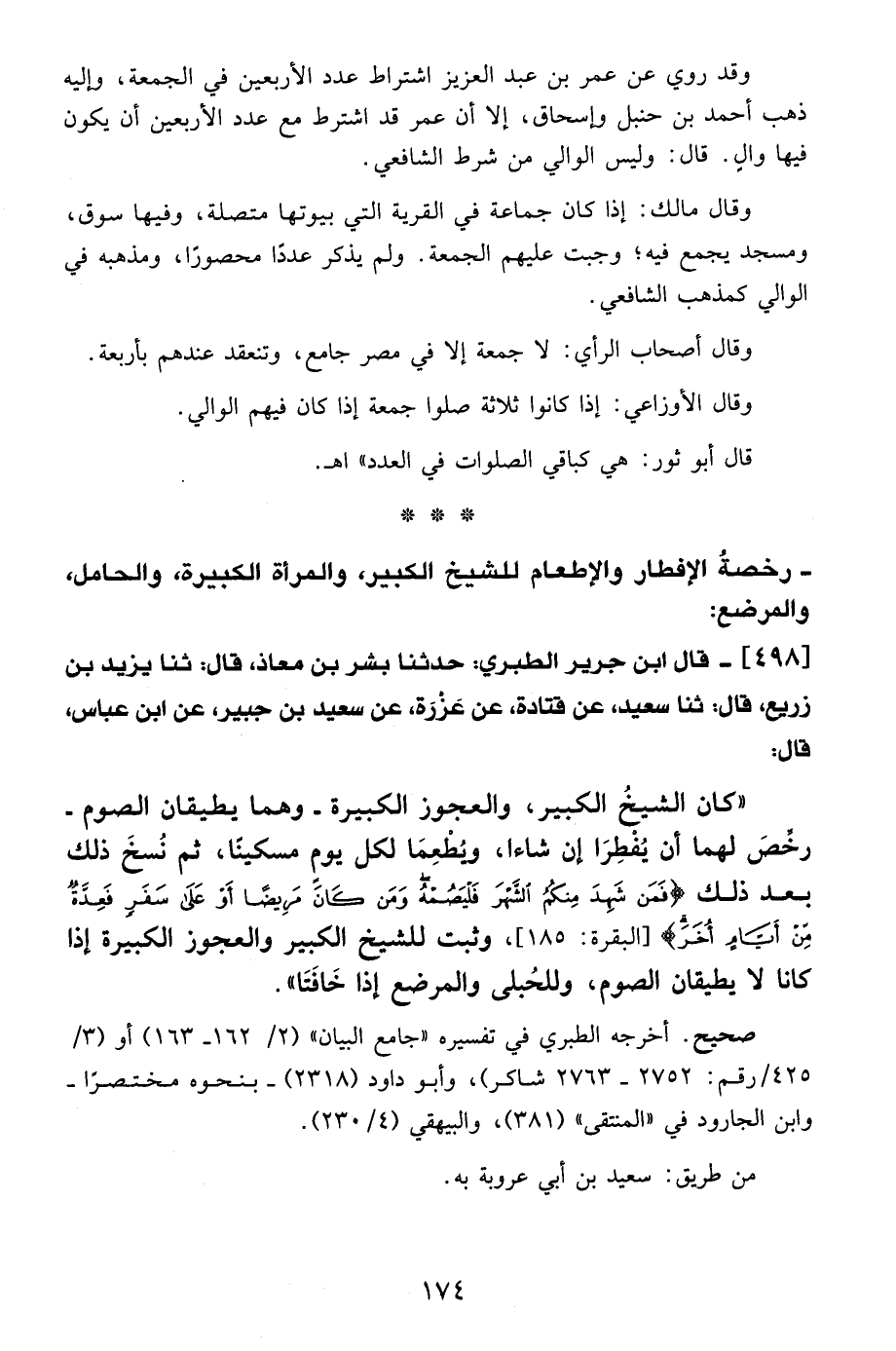 "كان الشيخُ الكبير، والعجوز الكبيرة- وهما يطيقان الصوم- رخَّصَ لهما أن يُفْطِرَا إن شاءا، ويُطْعِمَا لكل يوم مسكينًا، ثم نُسخَ ذلك بعد ذلك {فَمَنْ شَهِدَ مِنْكُمُ الشَّهْرَ فَلْيَصُمْهُ وَمَنْ كَانَ مَرِيضًا أَوْ عَلَى سَفَرٍ فَعِدَّةٌ مِنْ أَيَّامٍ أُخَرَ} [البقرة: 185]، وثبت للشيخ الكبير والعجوز الكبيرة إذا كانا لا يطيقان الصوم، وللحُبلى والمرضع إذا خَافَتَا".