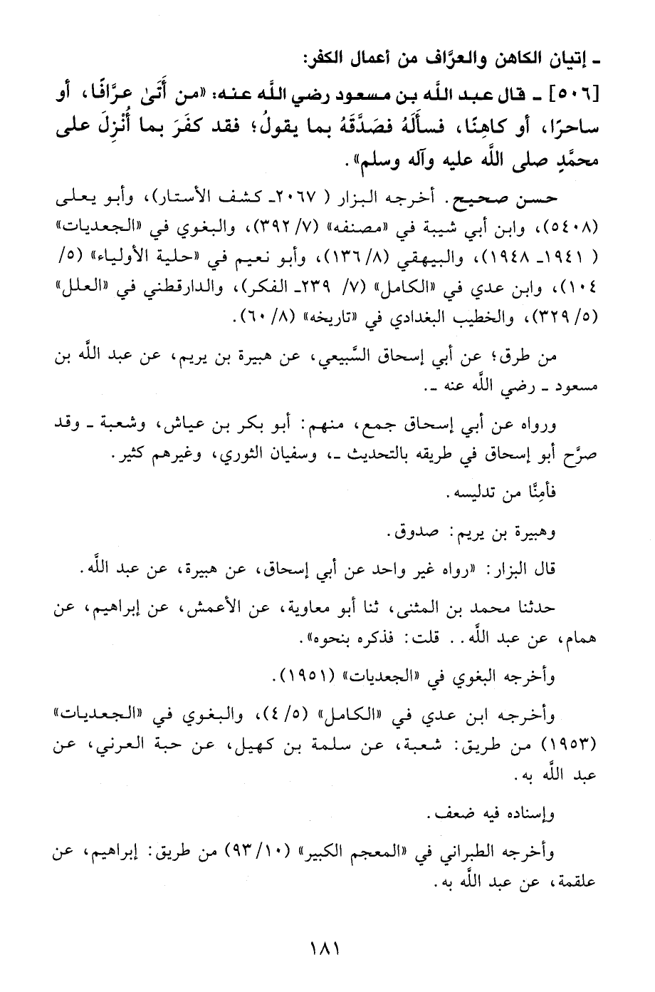 506 - قال عبد الله بن مسعود - رضي الله عنه -: "من أَتَى عرَّافًا، أو ساحرًا، أو كاهِنًا، فسأَلَهُ فصَدَّقَهُ بما يقولُ؛ فقد كفَرَ بما أُنْزِلَ على محمَّدِ - صلى الله عليه وآله وسلم -".