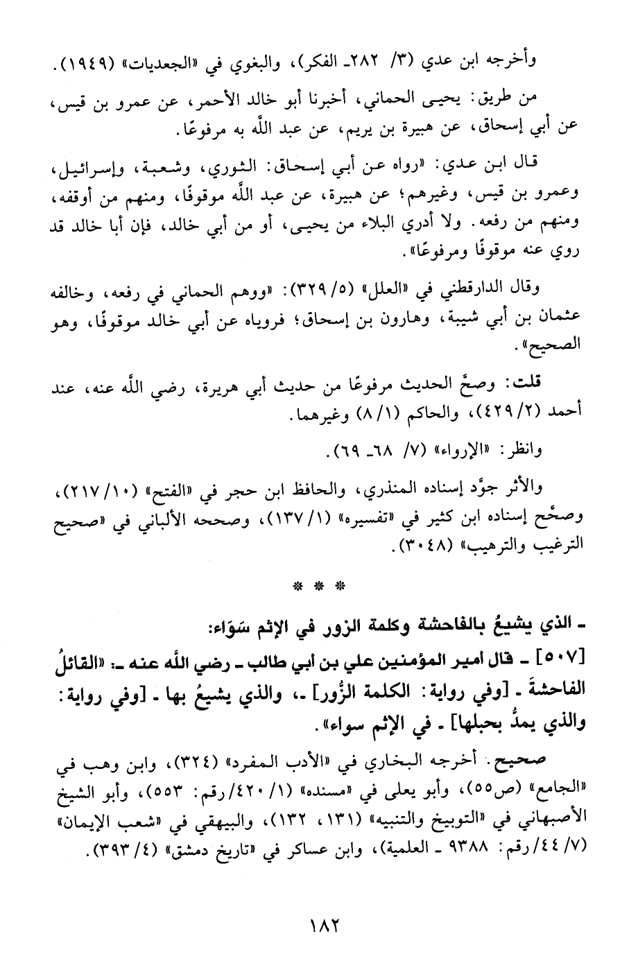 507 - قال أمير المؤمنين علي بن أبي طالب - رضي الله عنه -: "القائلُ الفاحشةَ-[وفي رواية: الكلمة الزُّور]-، والذي يشيعُ بها-[وفي رواية: والذي يمدُّ بحبلها]. في الإثم سواء".